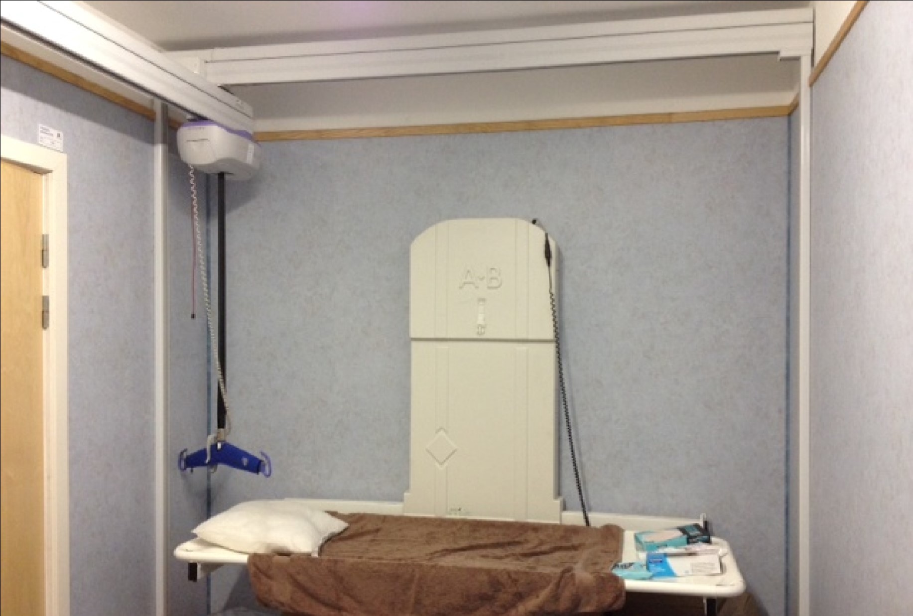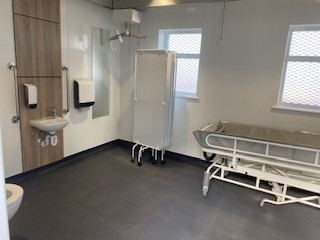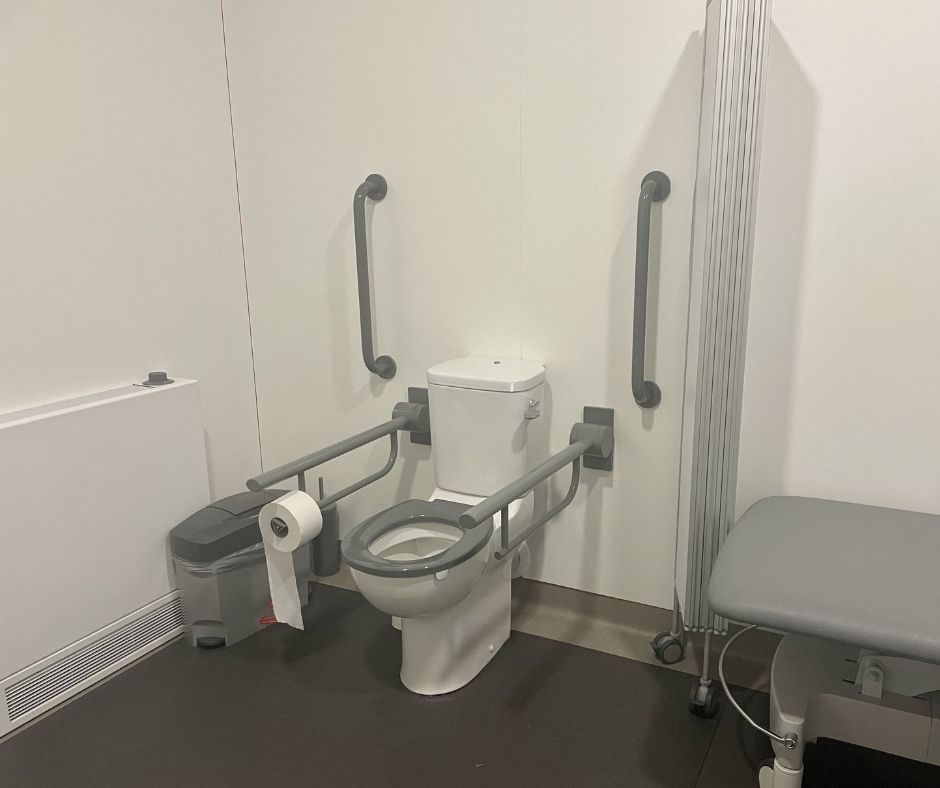 FACILITIES: Bench – Height Adjustable, Adult Sized, Free Standing | Hoist – Ceiling | Peninsular Toilet | Non-Slip Floor | Floor Space (sq. m) – 13 | Emergency Alarm | Privacy Screen | Paper Roll | Managed