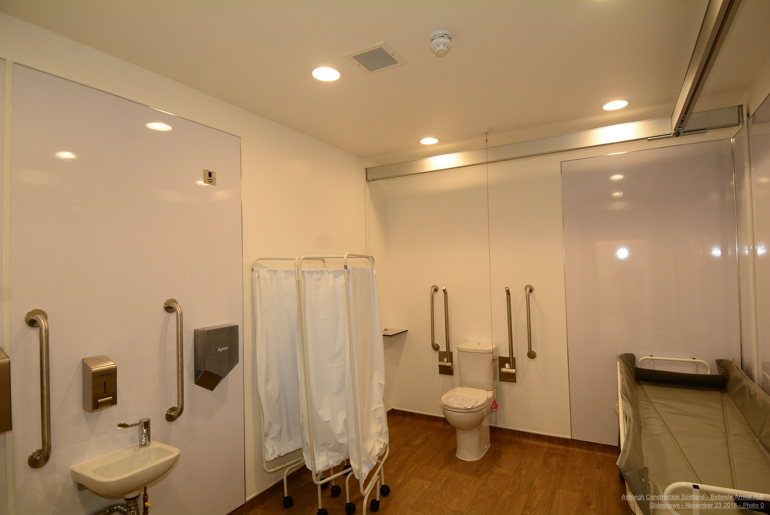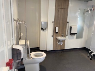 FACILITIES: Bench – Height Adjustable, Adult Sized, Wall Mounted | Hoist – Ceiling | Peninsular Toilet | Height Adjustable Washbasin | Non-Slip Floor | Floor Space (sq. m) – 12 | Emergency Alarm | Radar Key | Managed Locked | Colostomy Shelf