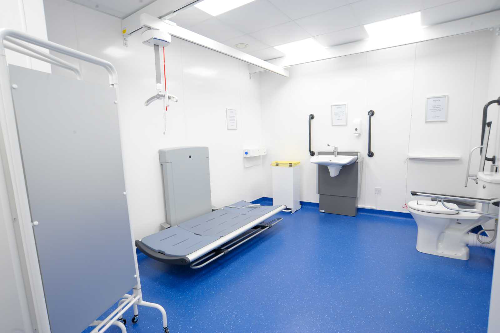 FACILITIES: Bench – Height Adjustable, Adult Sized, Wall Mounted | Hoist – Ceiling | Peninsular Toilet | Height Adjustable Washbasin | Non-Slip Floor | Floor Space (sq. m) – 12 | Emergency Alarm | Privacy Screen | Paper Roll Managed