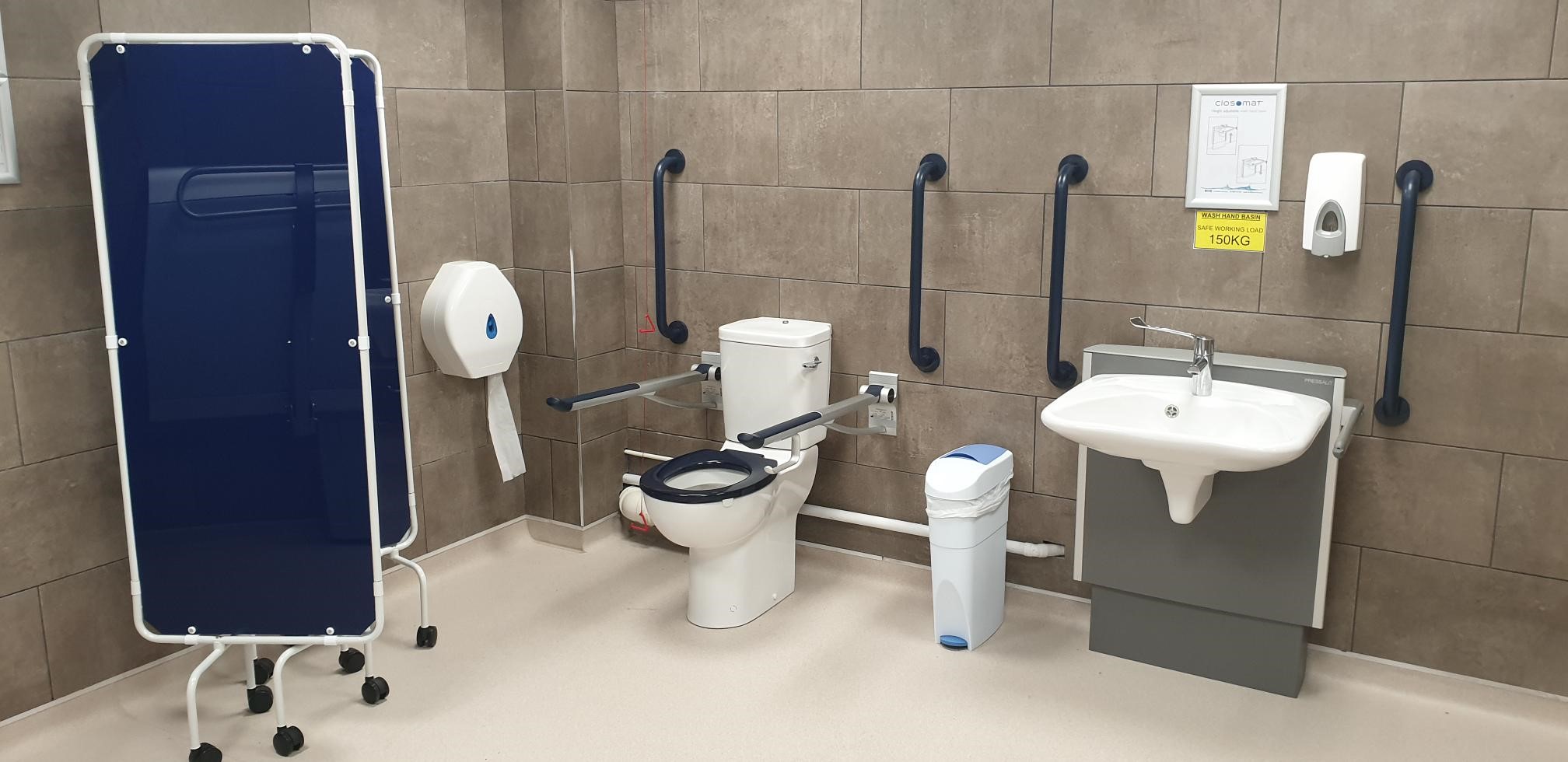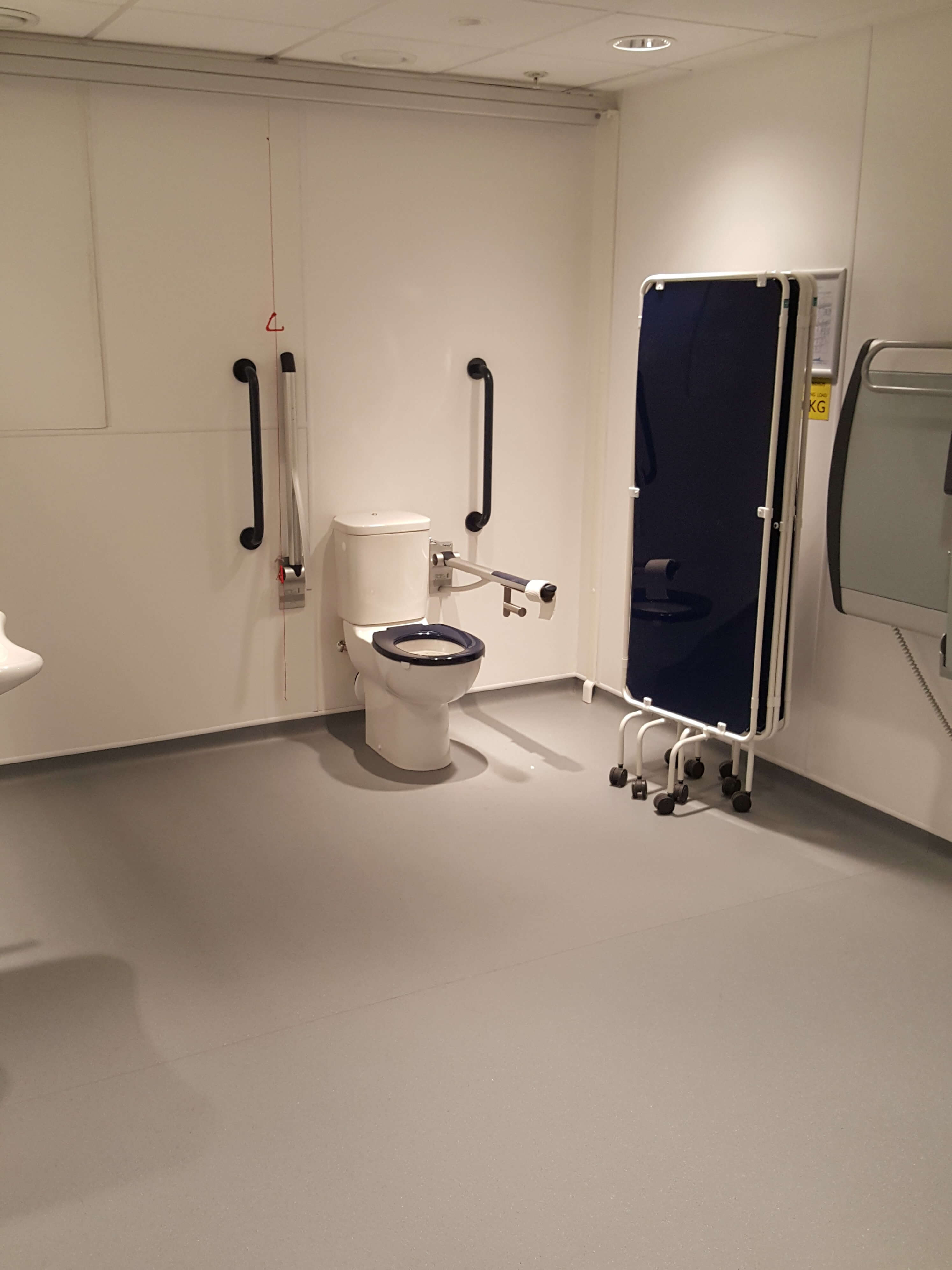 FACILITIES: Bench – Height Adjustable, Adult Sized, Free Standing | Hoist – Ceiling | Peninsular Toilet | Non-Slip Floor | Floor Space (sq. m) – 7 | Emergency Alarm | Privacy Screen | Paper Roll | Radar Key | Managed | Locked Colostomy Shelf