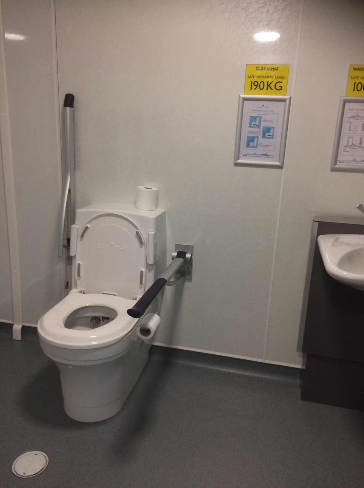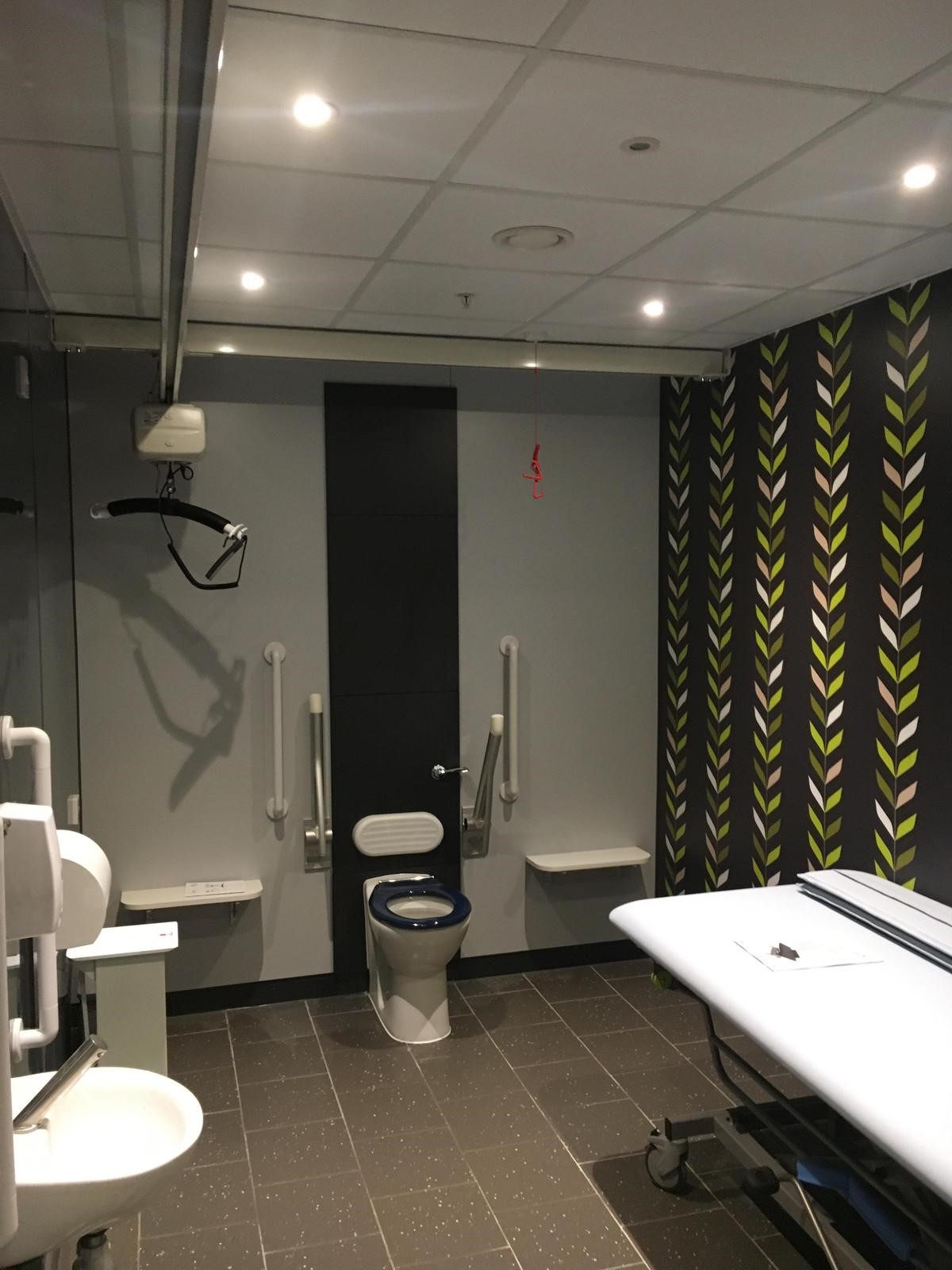 FACILITIES: Bench – Height Adjustable, Adult Sized, Free Standing | Hoist – Ceiling | Peninsular Toilet | Non-Slip Floor | Floor Space (sq. m) – 11 | Emergency Alarm | Privacy Screen | Paper Roll | Radar Key | Managed | Locked