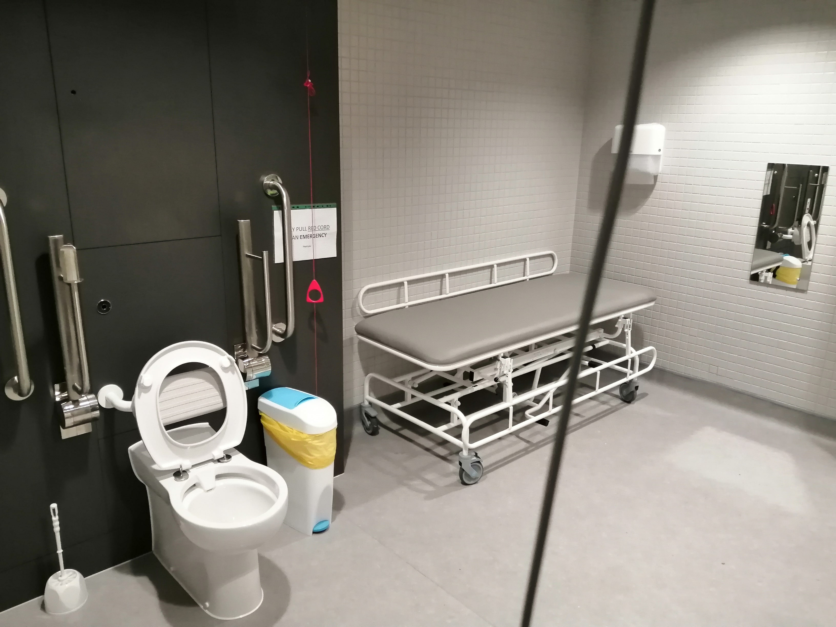 FACILITIES: Bench – Height Adjustable, Adult Sized, Free Standing | Hoist – Ceiling | Peninsular Toilet | Non-Slip Floor | Floor Space (sq. m) – 11 | Emergency Alarm | Privacy Screen | Paper Roll | Managed | Colostomy Shelf
