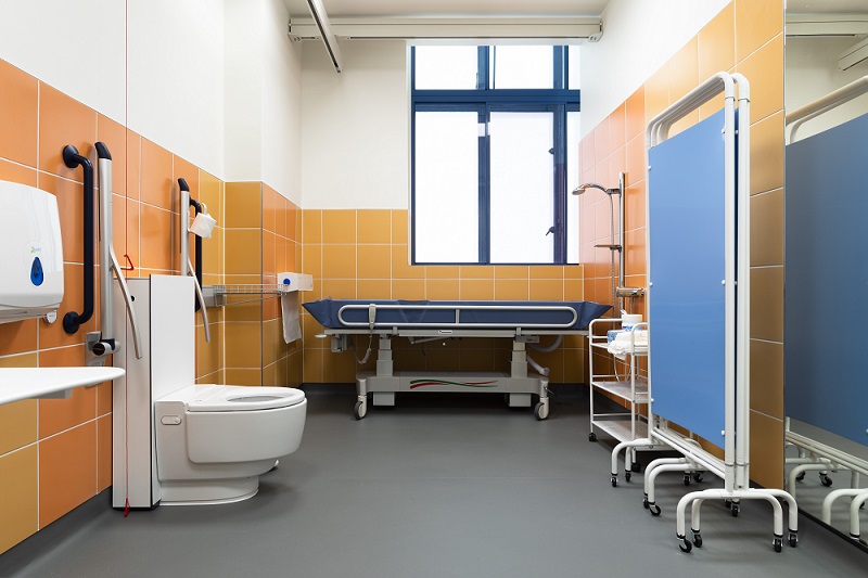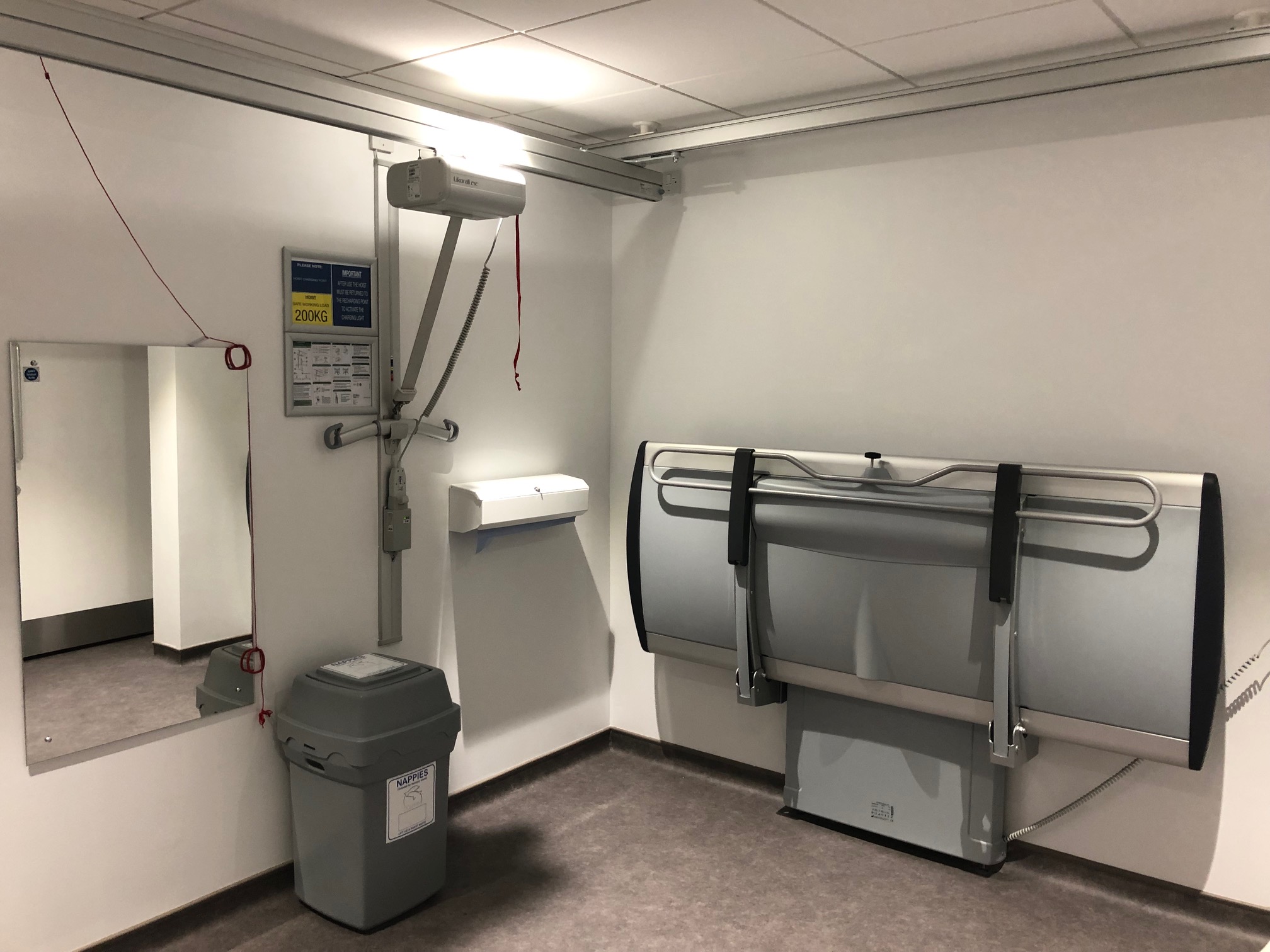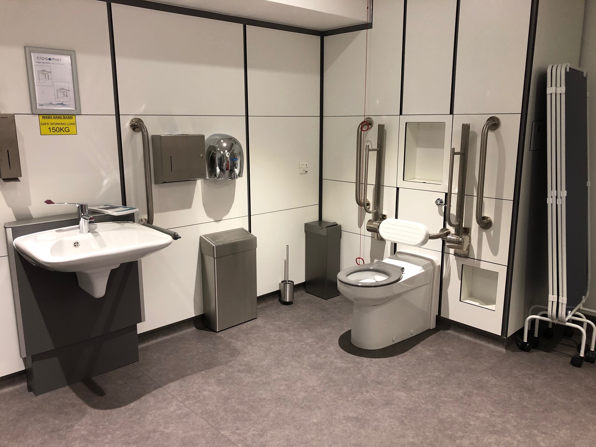 FACILITIES: Bench – Height Adjustable, Adult Sized, Wall Mounted | Hoist – Ceiling | Peninsular Toilet | Height Adjustable Washbasin | Floor Space (sq. m) – 10 | Emergency Alarm | Privacy Screen | Radar Key | Managed Colostomy Shelf