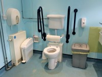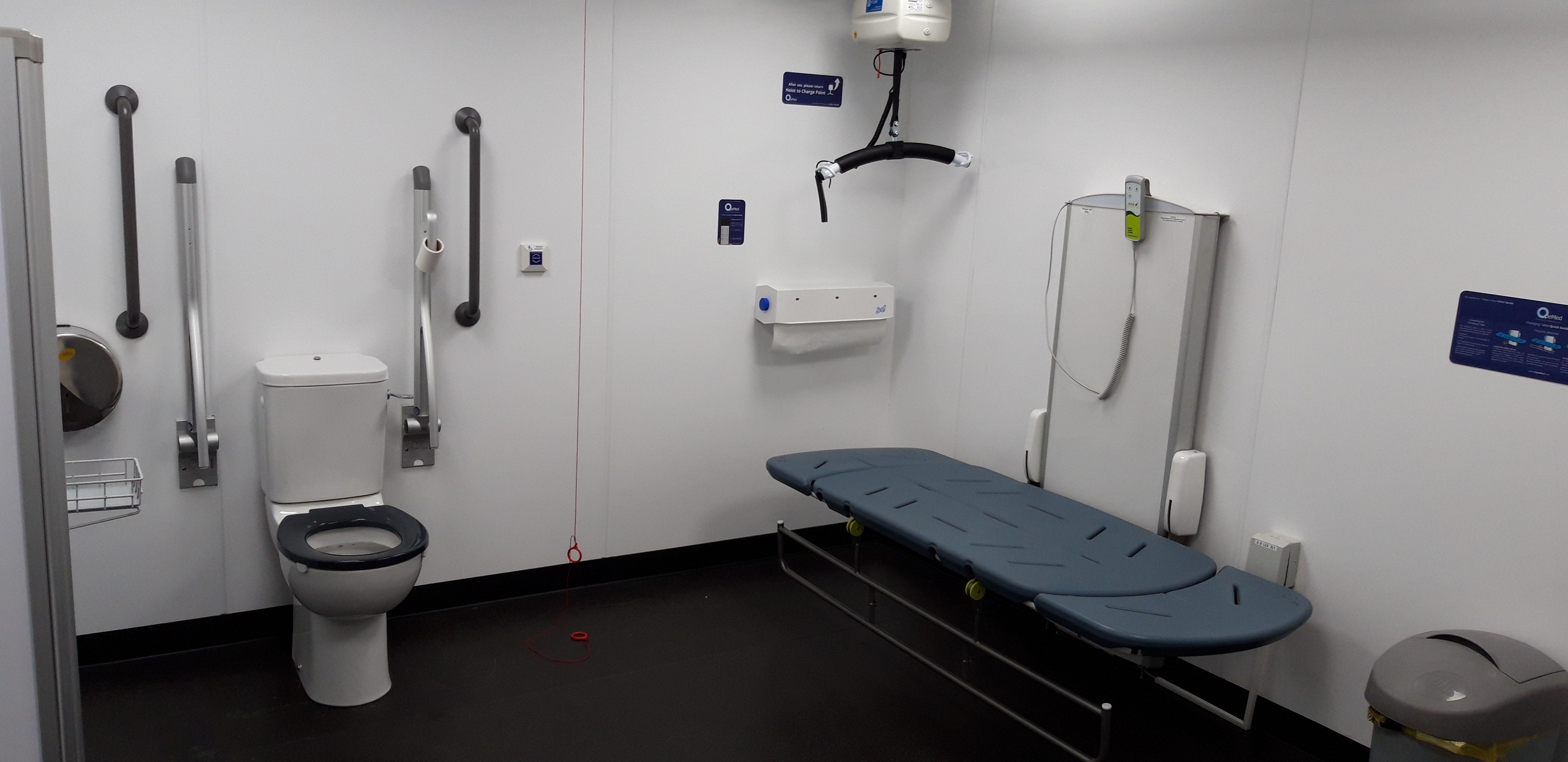 FACILITIES: Bench – Height Adjustable, Adult Sized, Wall Mounted | Hoist – Ceiling | Peninsular Toilet | Non-Slip Floor | Floor Space (sq. m) – 12 | Emergency Alarm | Privacy Screen | Paper Roll | Managed | Locked | Colostomy Shelf