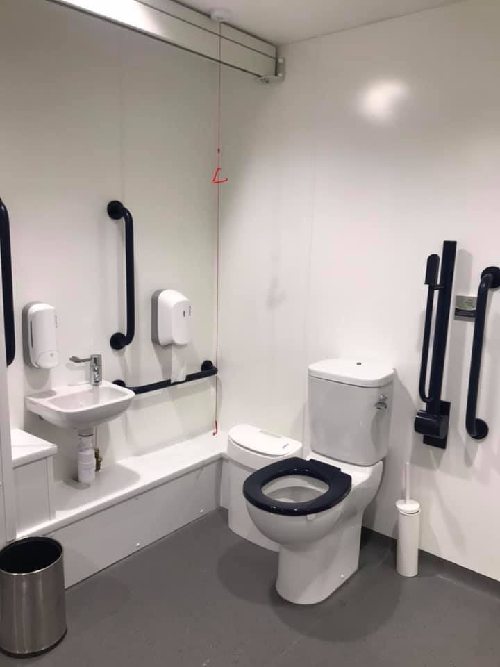 FACILITIES: Bench – Height Adjustable, Adult Sized, Wall Mounted | Hoist – Ceiling | Peninsular Toilet | Height Adjustable Washbasin | Non-Slip Floor | Floor Space (sq. m) – 12 | Emergency Alarm | Privacy Screen | Paper Roll Radar Key | Managed | Locked | Colostomy Shelf