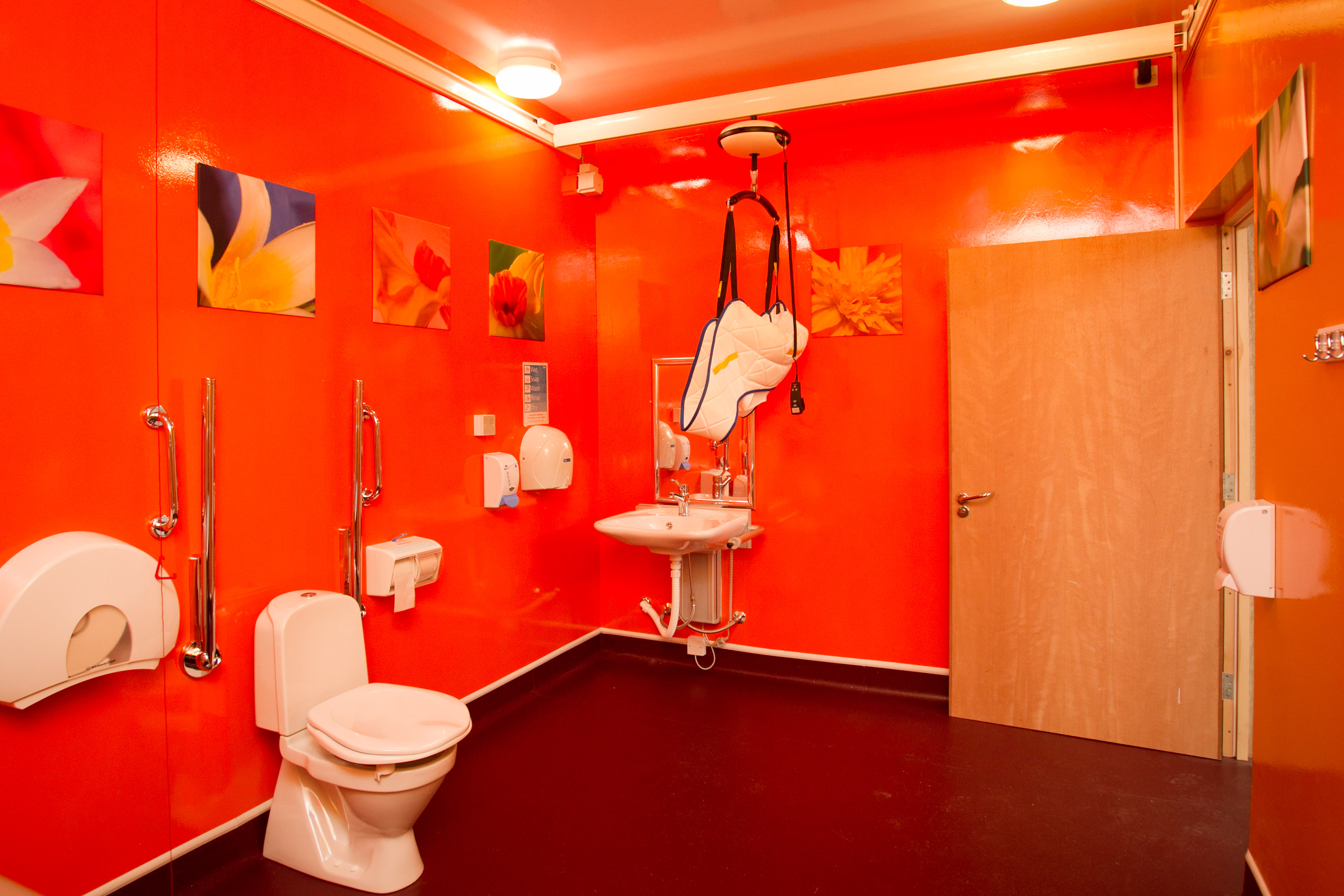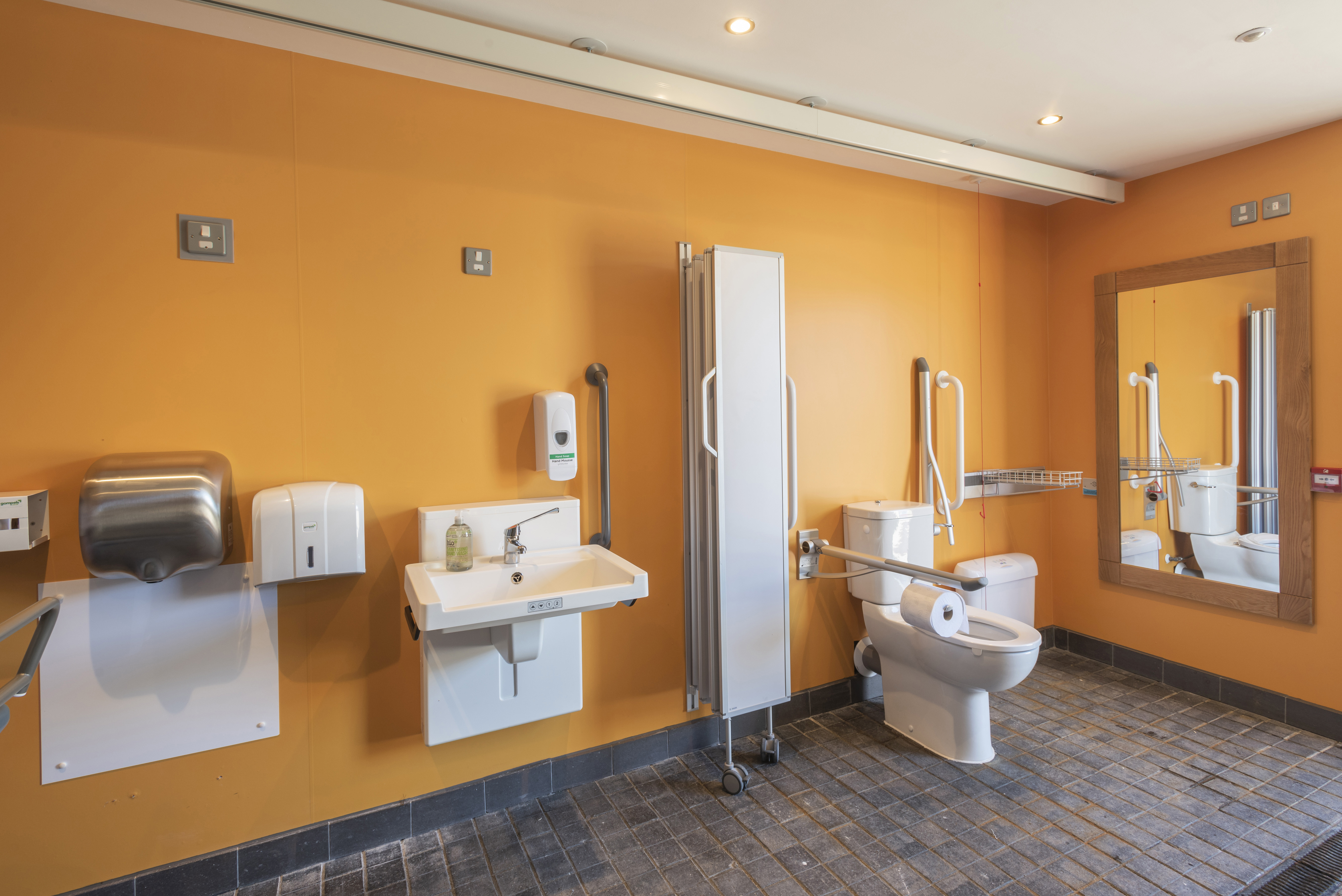 FACILITIES: Bench – Height Adjustable, Adult Sized, Wall Mounted | Hoist – Ceiling | Peninsular Toilet | Height Adjustable Washbasin | Non-Slip Floor | Floor Space (sq. m) – 13 | Emergency Alarm | Privacy Screen | Paper Roll Radar Key | Managed | Locked | Colostomy Shelf