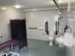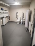 FACILITIES: Bench – Height Adjustable, Adult Sized, Free Standing | Hoist – Ceiling | Peninsular Toilet | Non-Slip Floor | Floor Space (sq. m) – 12 | Emergency Alarm | Privacy Screen | Paper Roll | Radar Key | Locked | Accessible Shower | Colostomy Shelf