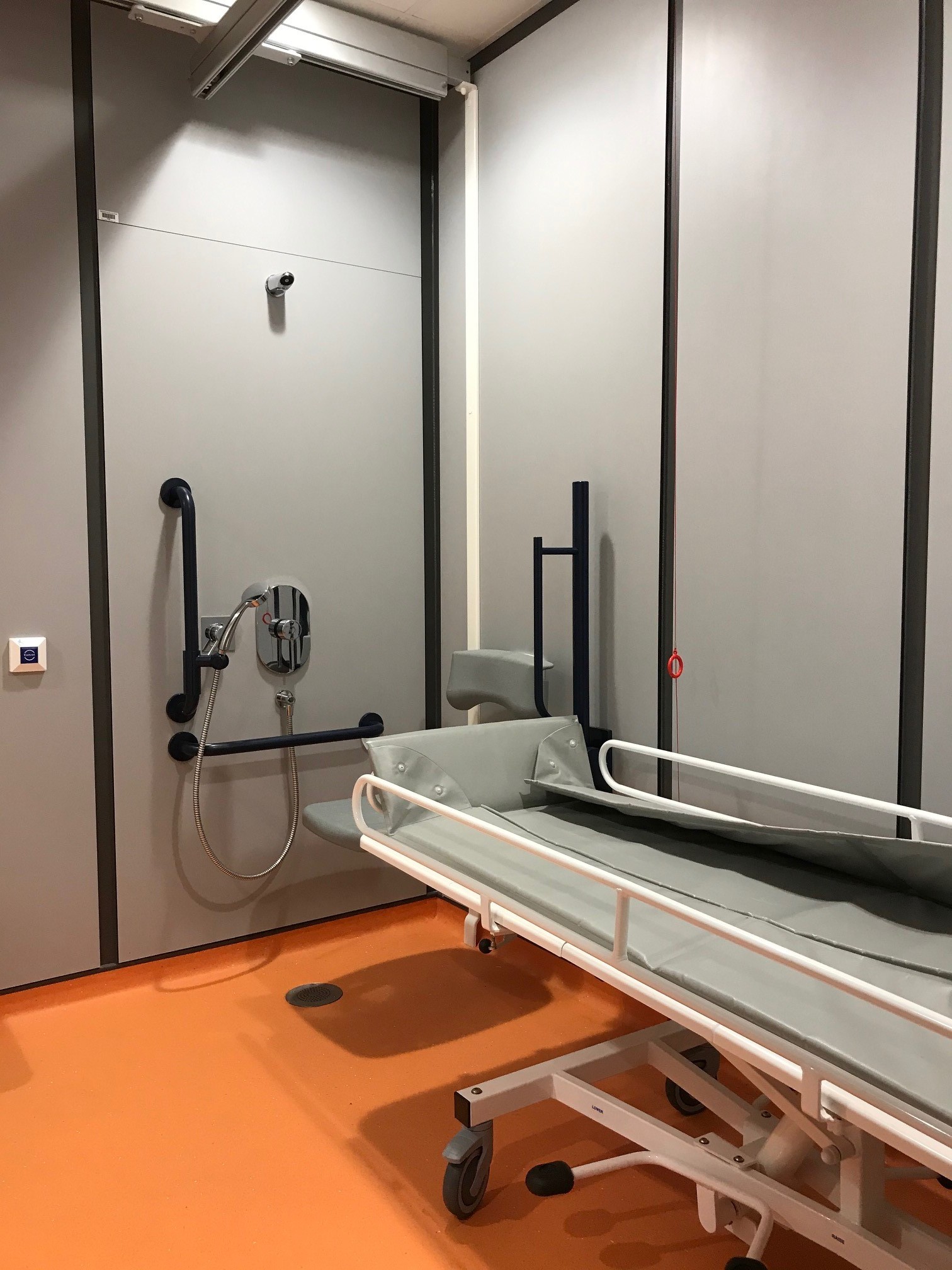 FACILITIES: Bench – Height Adjustable, Adult Sized, Free Standing | Hoist – Ceiling | Peninsular Toilet | Non-Slip Floor | Floor Space (sq. m) – 12 | Emergency Alarm | Paper Roll | Managed | Accessible Shower