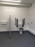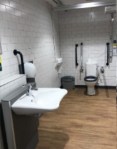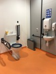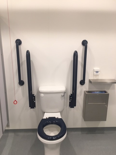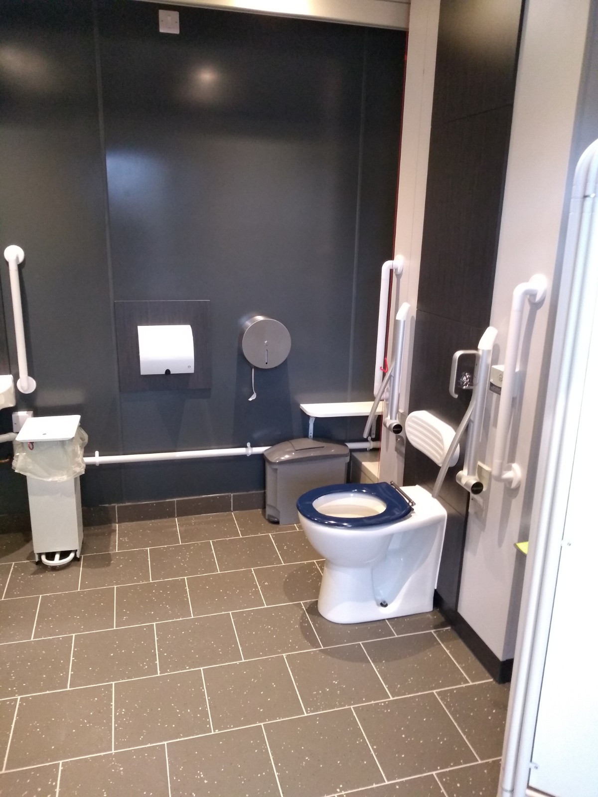 FACILITIES: Bench – Height Adjustable, Adult Sized, Wall Mounted | Hoist – Ceiling | Peninsular Toilet | Non-Slip Floor | Floor Space (sq. m) – 14 | Emergency Alarm | Privacy Screen | Paper Roll | Radar Key | Locked | Colostomy Shelf