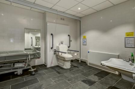 FACILITIES: Bench – Height Adjustable, Adult Sized, Wall Mounted | Hoist – Ceiling | Peninsular Toilet | Non-Slip Floor | Floor Space (sq. m) – 19 | Emergency Alarm | Privacy Screen | Paper Roll | Radar Key | Managed | Locked Accessible Shower | Colostomy Shelf