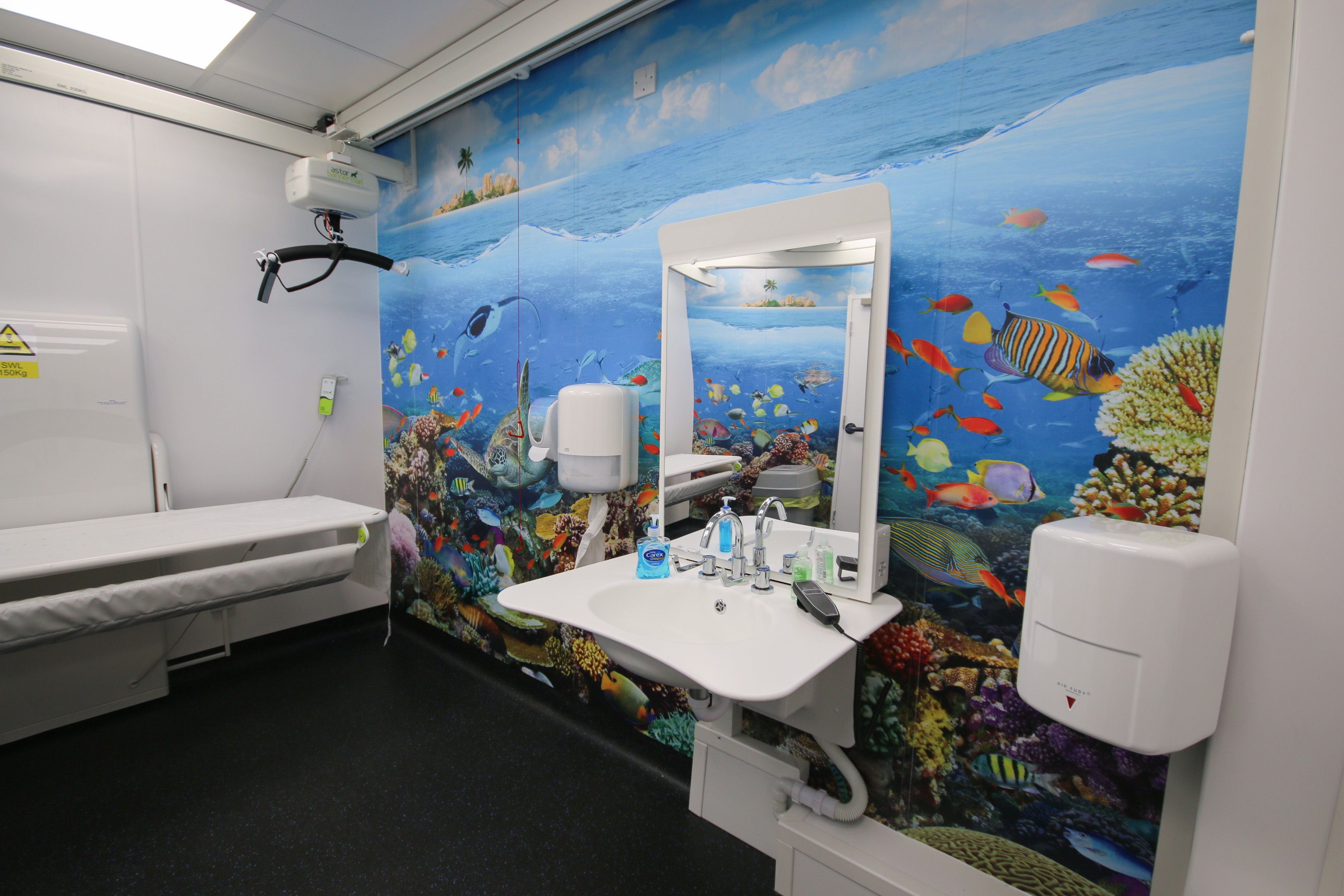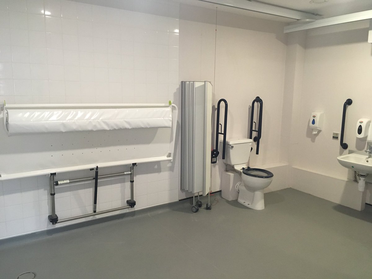 FACILITIES: Bench – Height Adjustable, Adult Sized, Free Standing | Hoist – Ceiling | Peninsular Toilet | Height Adjustable Washbasin | Non-Slip Floor | Floor Space (sq. m) – 11 | Emergency Alarm | Privacy Screen | Paper Roll Radar Key | Managed | Locked | Colostomy Shelf