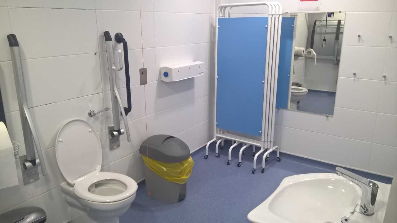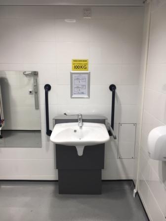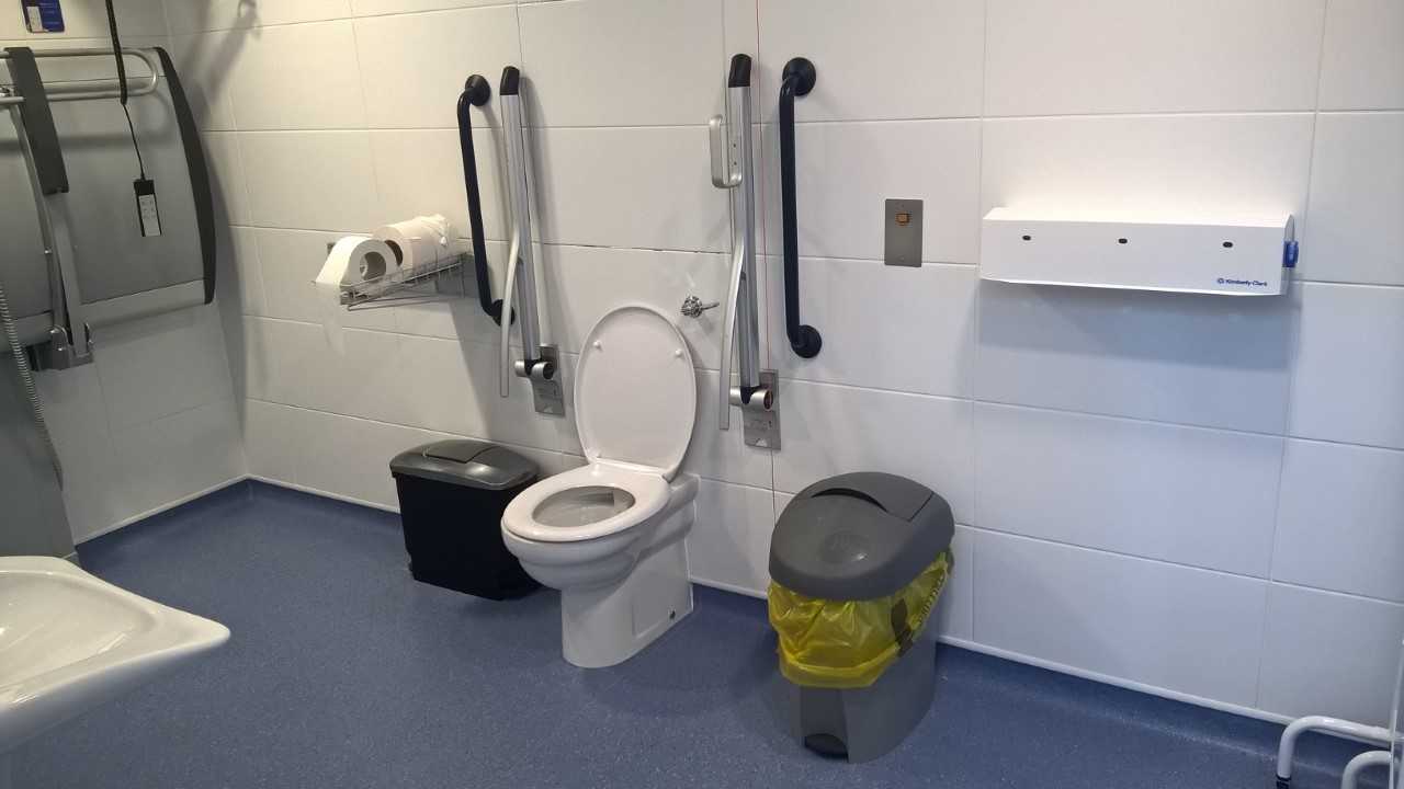 FACILITIES: Bench – Height Adjustable, Adult Sized, Wall Mounted | Hoist – Ceiling | Peninsular Toilet | Non-Slip Floor | Emergency Alarm | Privacy Screen | Paper Roll | Radar Key | Managed | Locked