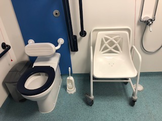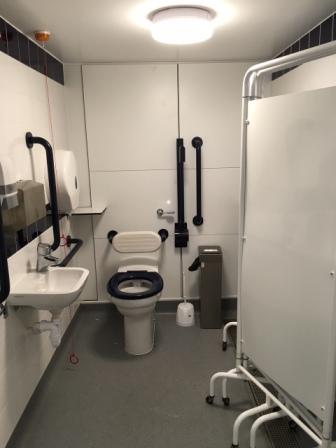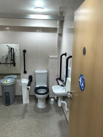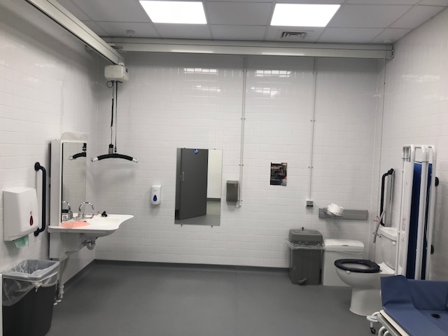FACILITIES: Bench – Height Adjustable, Adult Sized, Free Standing | Hoist – Ceiling | Peninsular Toilet | Non-Slip Floor | Floor Space (sq. m) – 7 | Emergency Alarm | Privacy Screen | Paper Roll | Radar Key | Managed | Locked Accessible Shower