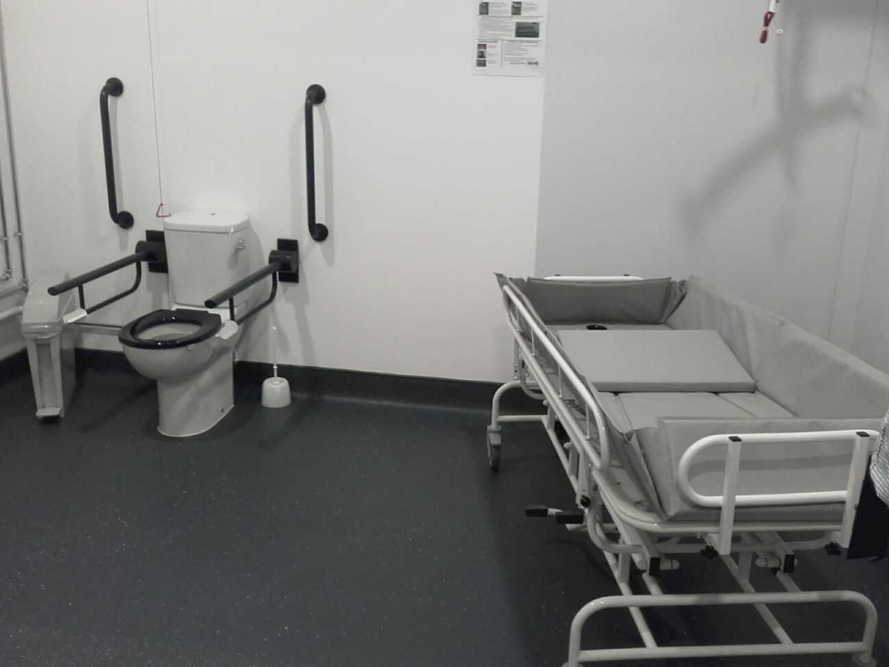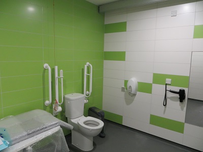 FACILITIES: Bench – Height Adjustable, Adult Sized, Wall Mounted | Hoist – Mobile | Peninsular Toilet | Height Adjustable Washbasin | Non-Slip Floor | Floor Space (sq. m) – 12 | Emergency Alarm | Paper Roll | Radar Key Managed | Locked