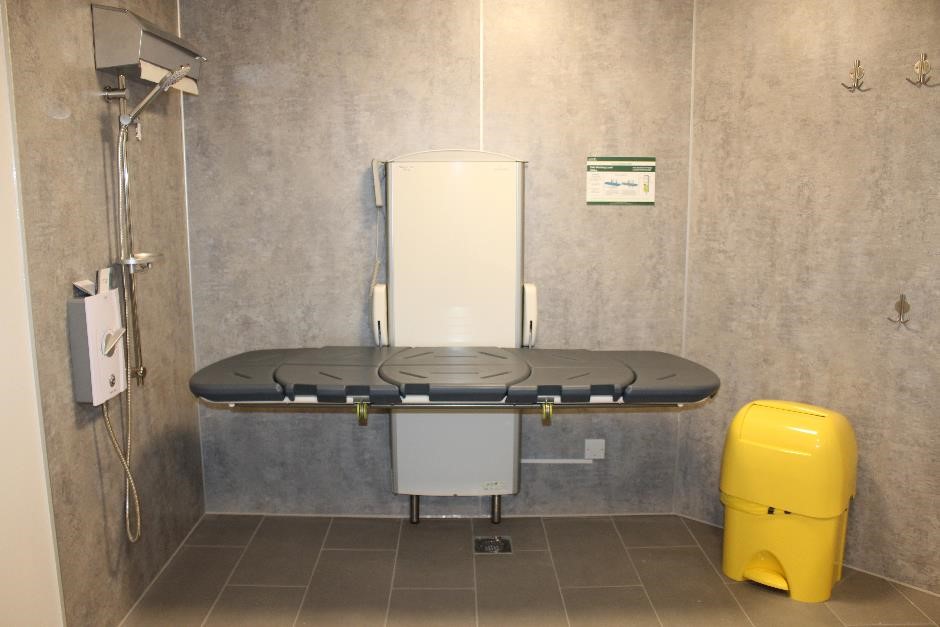 FACILITIES: Bench – Height Adjustable, Adult Sized, Free Standing | Hoist – Ceiling | Peninsular Toilet | Non-Slip Floor | Floor Space (sq. m) – 12 | Emergency Alarm | Paper Roll | Managed | Locked | Accessible Shower