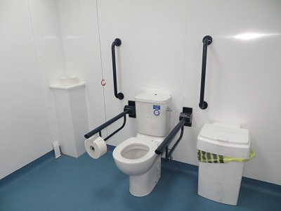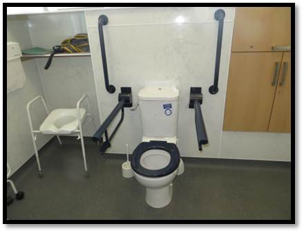 FACILITIES: Bench – Height Adjustable, Adult Sized, Free Standing | Hoist – Ceiling | Peninsular Toilet | Non-Slip Floor | Floor Space (sq. m) – 12 | Emergency Alarm | Paper Roll | Managed | Locked