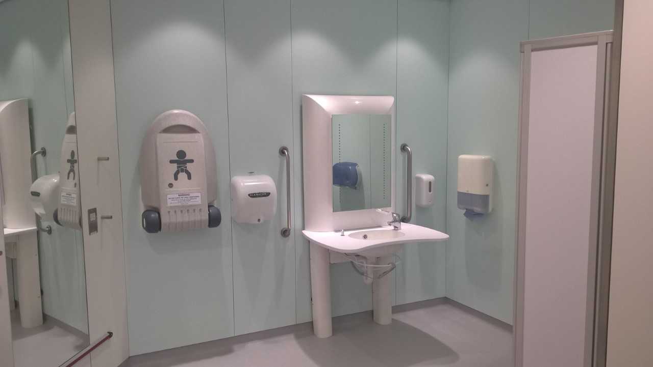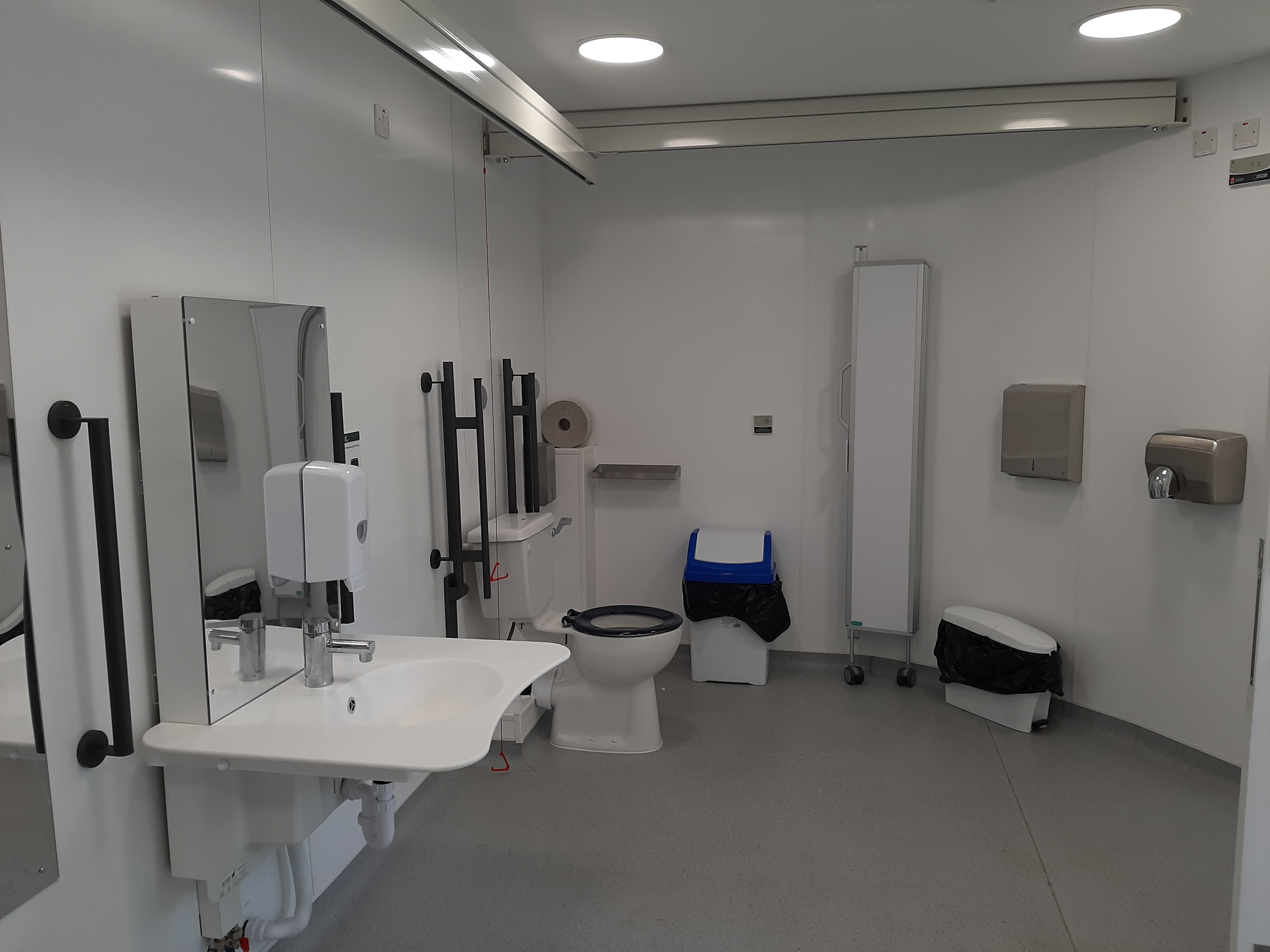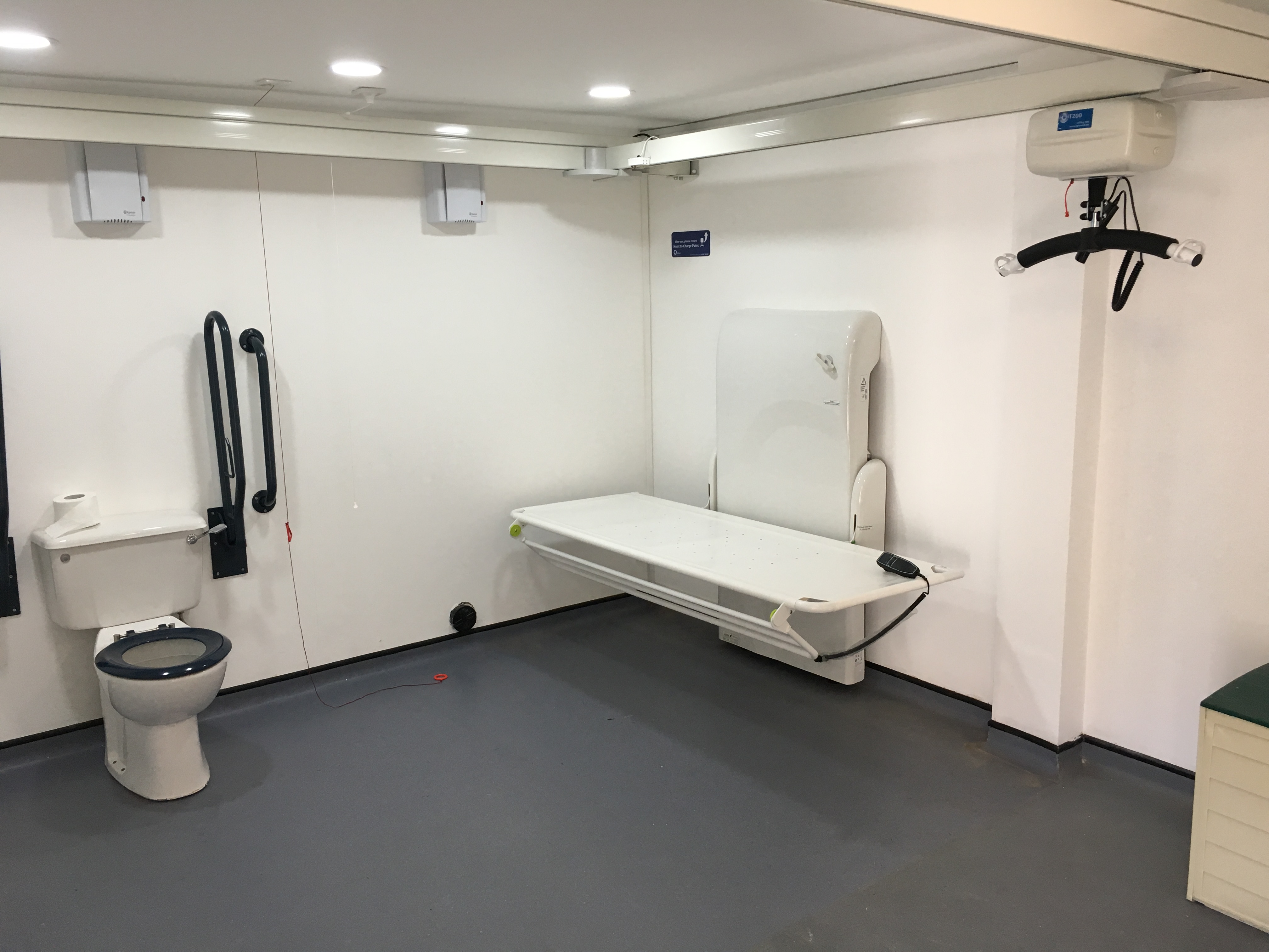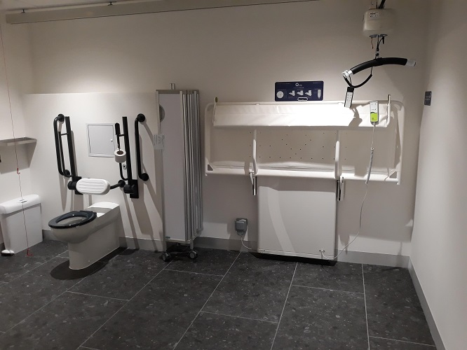FACILITIES: Bench – Height Adjustable, Adult Sized, Wall Mounted | Hoist – Ceiling | Peninsular Toilet | Height Adjustable Washbasin | Non-Slip Floor | Floor Space (sq. m) – 12 |Emergency Alarm | Privacy Screen | Paper Roll Radar Key | Managed | Locked | Colostomy Shelf