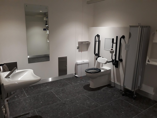 FACILITIES: Bench – Height Adjustable, Adult Sized, Wall Mounted | Hoist – Ceiling | Peninsular Toilet | Height Adjustable Washbasin | Non-Slip Floor | Floor Space (sq. m) – 18 |Emergency Alarm | Privacy Screen | Paper Roll Radar Key | Managed | Locked | Colostomy Shelf