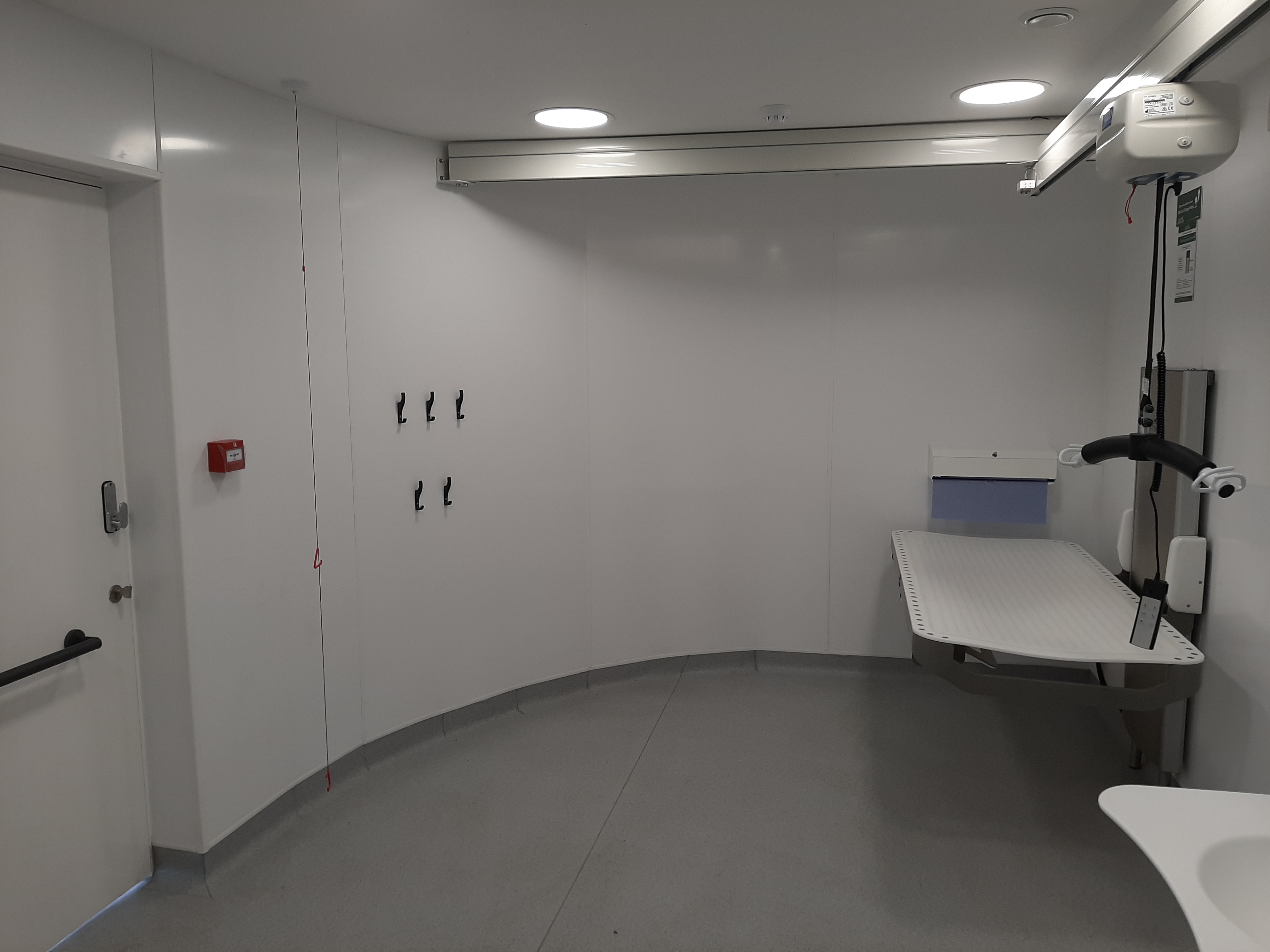 FACILITIES: Bench – Height Adjustable, Adult Sized, Free Standing | Hoist – Ceiling | Peninsular Toilet | Height Adjustable Washbasin | Non-Slip Floor | Floor Space (sq. m) – 12 | Emergency Alarm | Privacy Screen | Paper Roll Managed | Locked