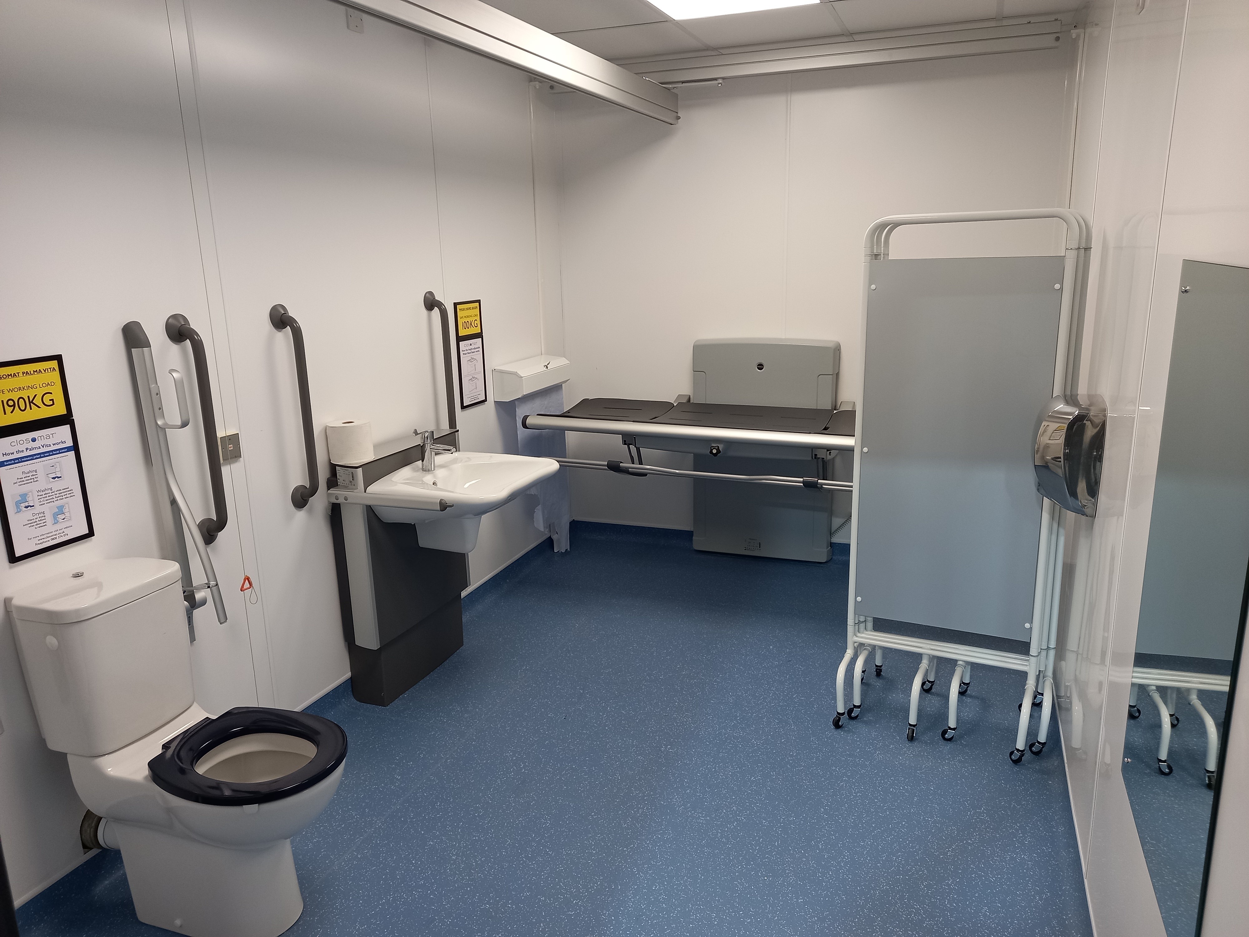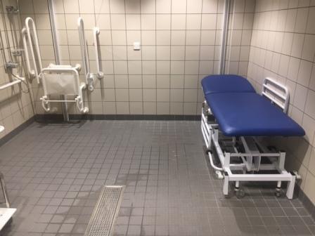 FACILITIES: Bench – Height Adjustable, Adult Sized, Free Standing | Hoist – Mobile | Peninsular Toilet | Height Adjustable Washbasin | Non-Slip Floor | Floor Space (sq. m) – 7.0 | Emergency Alarm | Paper Roll | Radar Key Managed | Locked