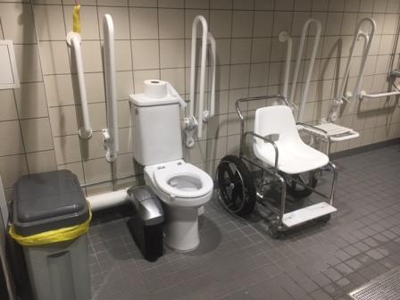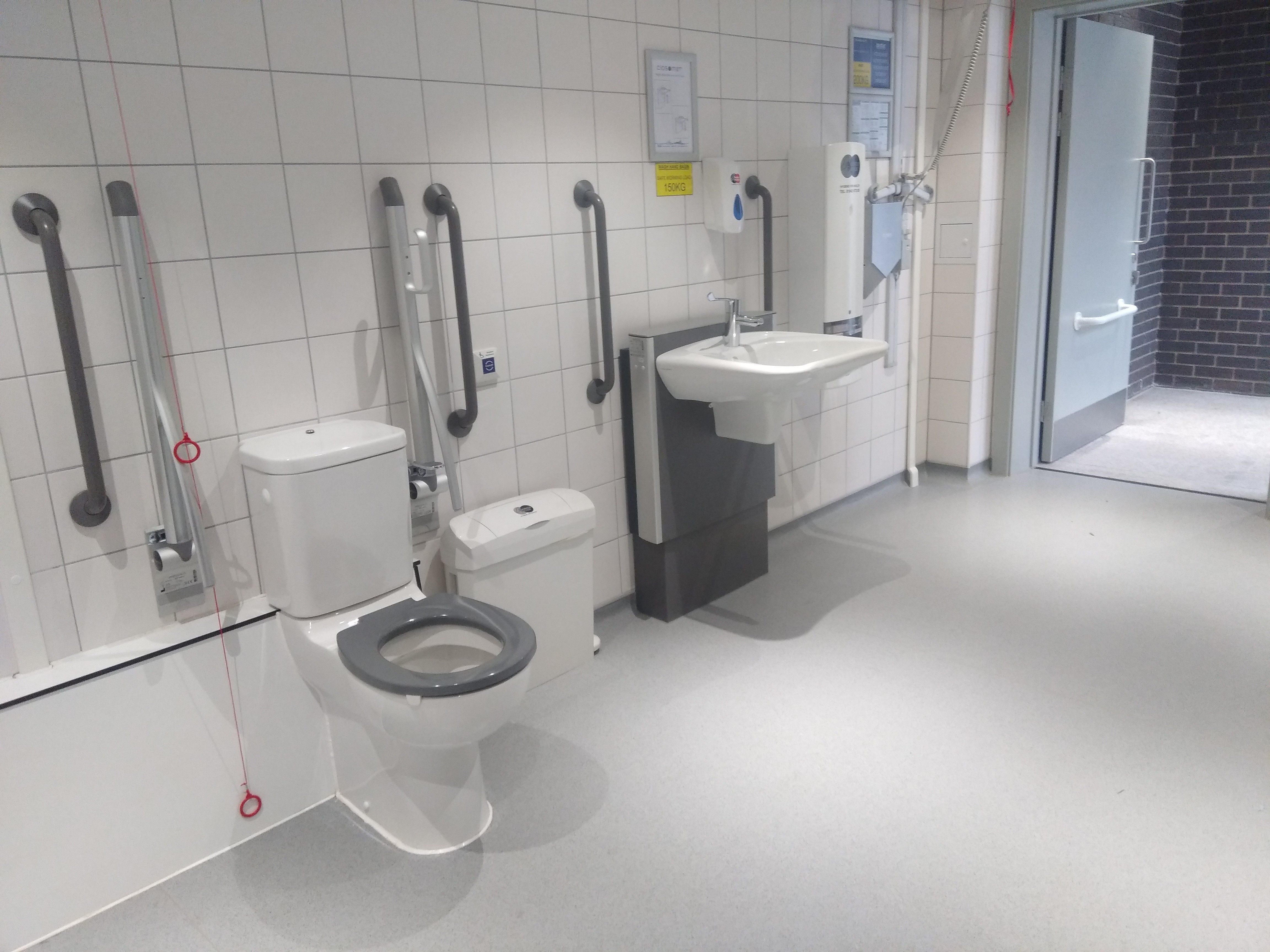 FACILITIES: Bench – Height Adjustable, Adult Sized, Wall Mounted | Hoist – Ceiling | Peninsular Toilet | Non-Slip Floor | Floor Space (sq. m) – 7.0 | Emergency Alarm | Privacy Screen | Paper Roll | Radar Key | Managed | Locked Colostomy Shelf