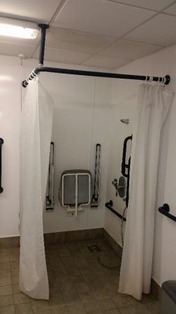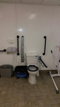 FACILITIES: Bench – Height Adjustable, Adult Sized, Free Standing | Hoist – Mobile | Peninsular Toilet | Non-Slip Floor | Floor Space (sq. m) – 10 | Emergency Alarm | Privacy Screen | Paper Roll | Radar Key | Managed | Locked Accessible Shower