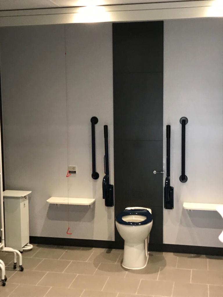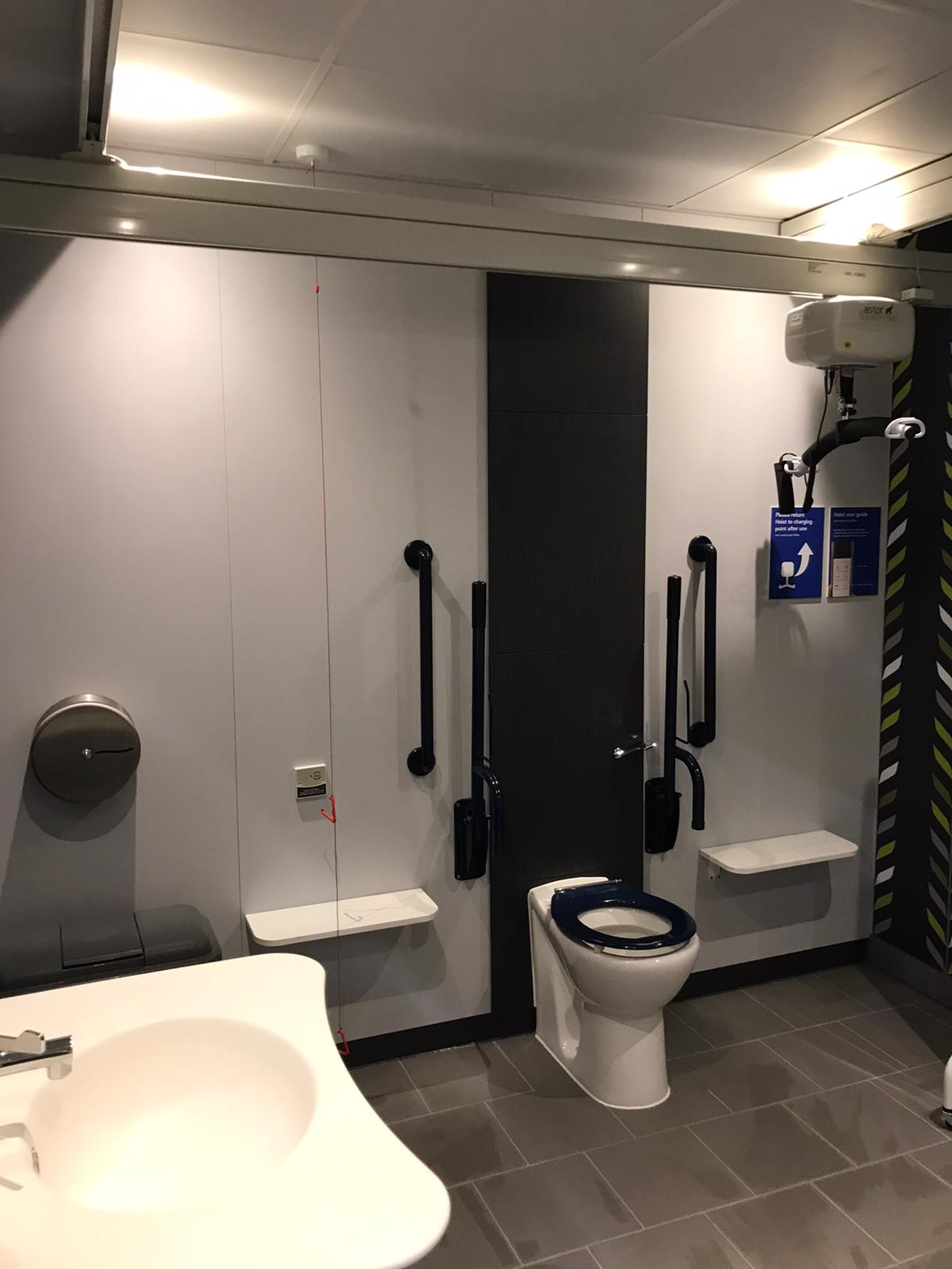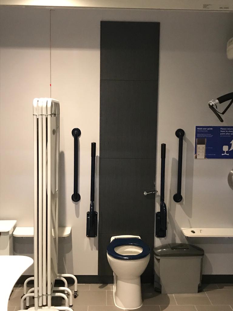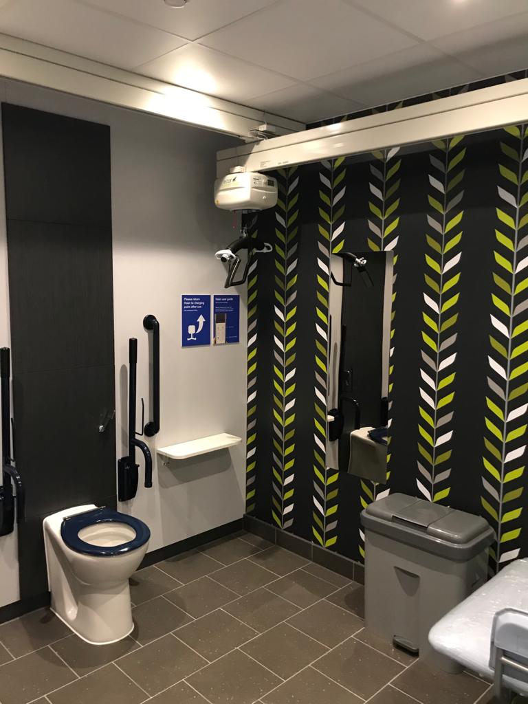 FACILITIES: Bench – Height Adjustable, Adult Sized, Free Standing | Hoist – Ceiling | Peninsular Toilet | Non-Slip Floor | Floor Space (sq. m) – 7.0 | Emergency Alarm | Privacy Screen | Paper Roll | Radar Key | Managed | Locked Colostomy Shelf