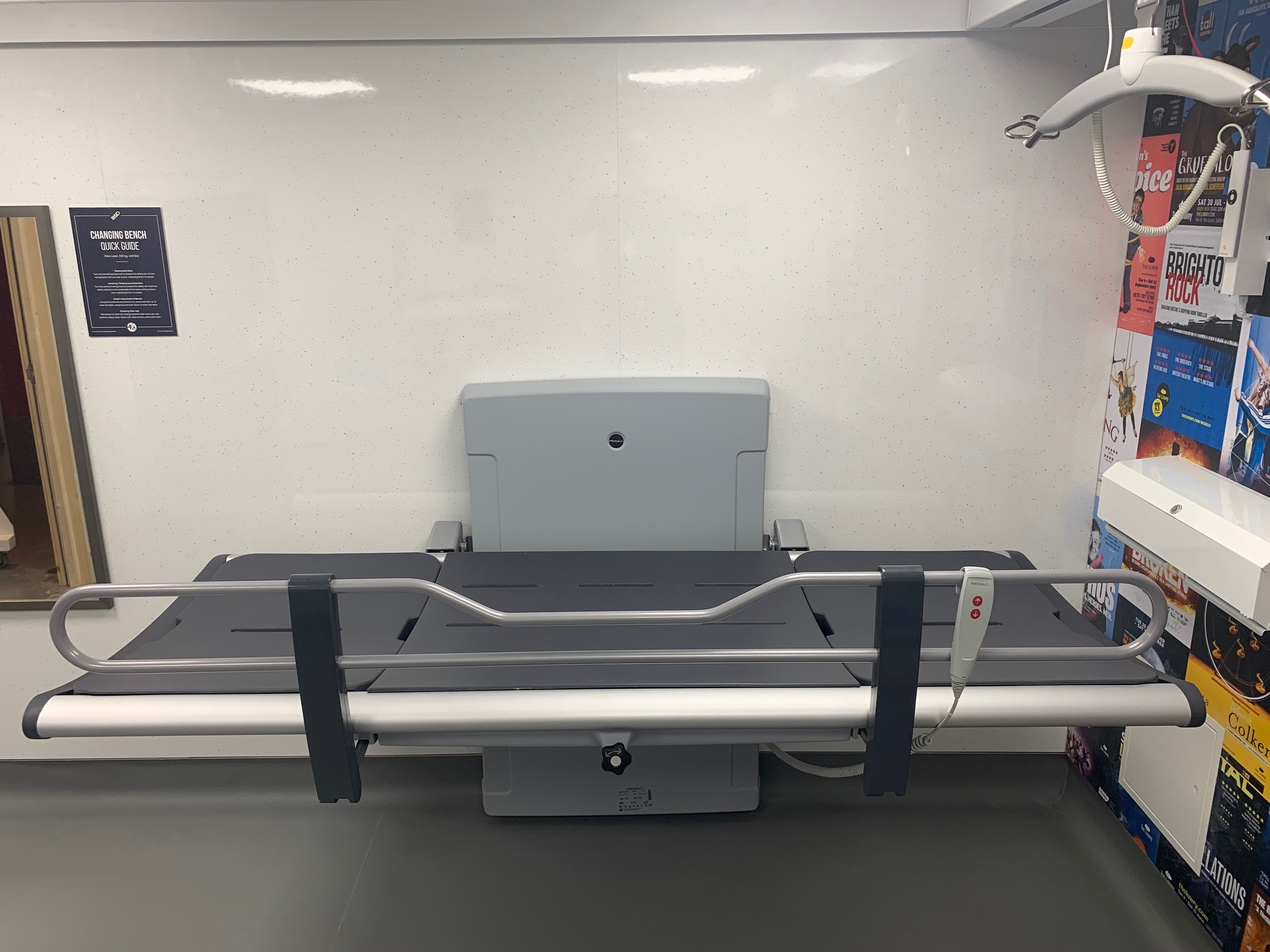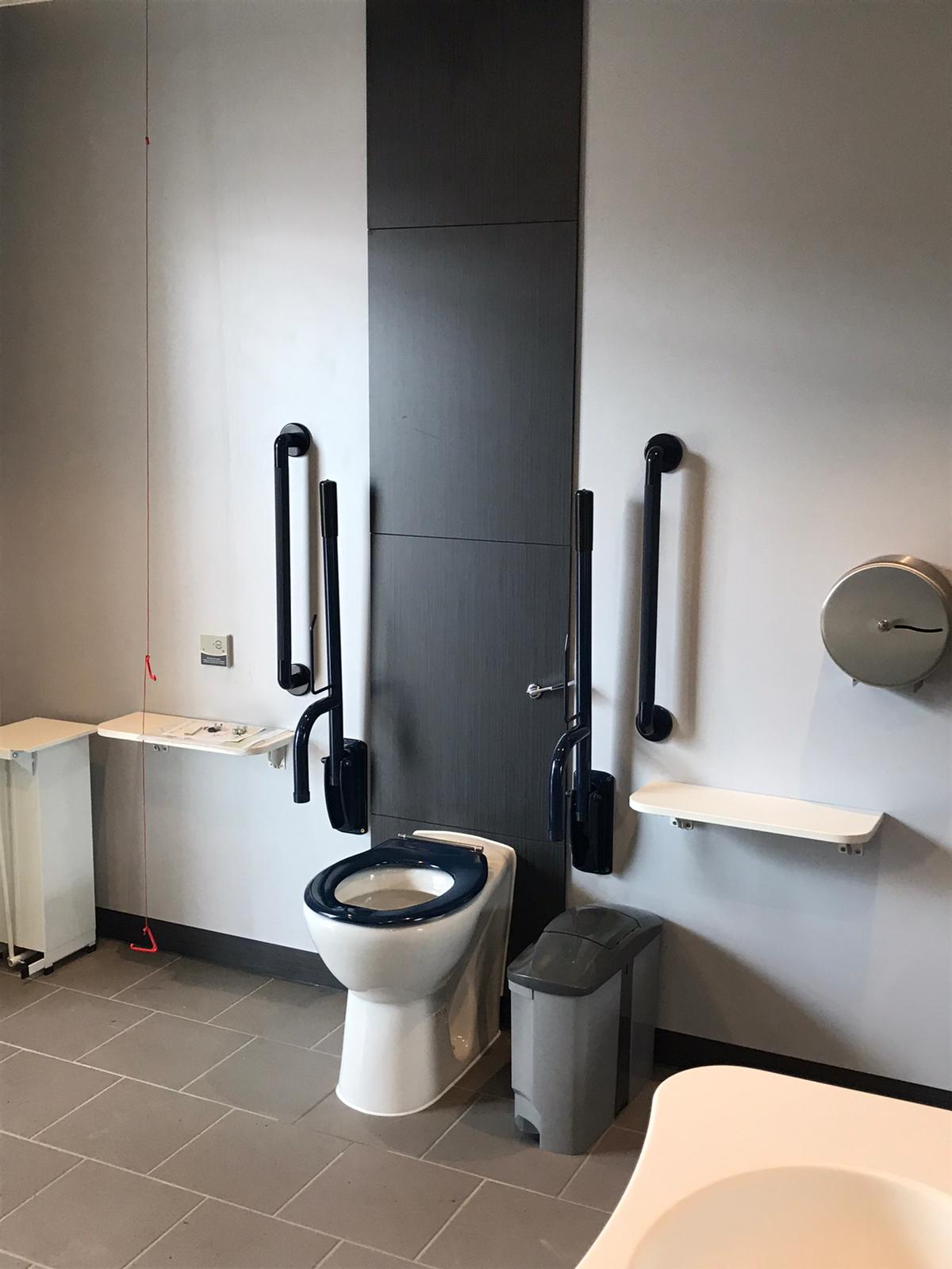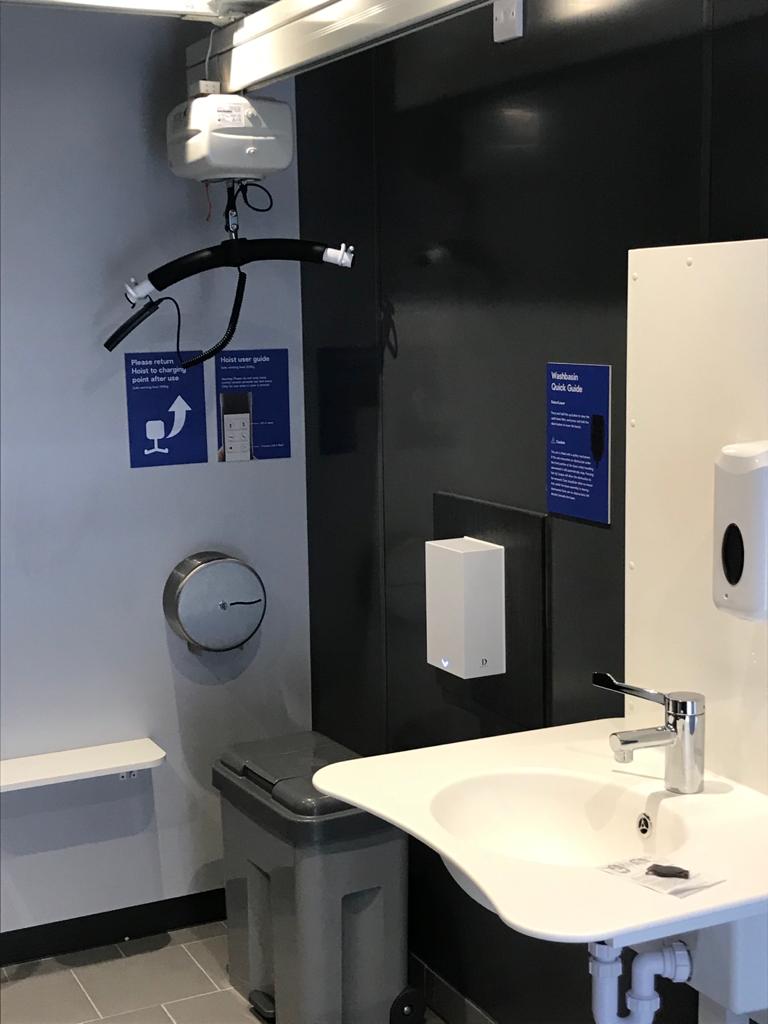 FACILITIES: Bench – Height Adjustable, Adult Sized, Free Standing | Hoist – Ceiling | Peninsular Toilet | Non-Slip Floor | Floor Space (sq. m) – 7.0 | Emergency Alarm | Privacy Screen | Paper Roll | Radar Key | Managed | Locked Colostomy Shelf