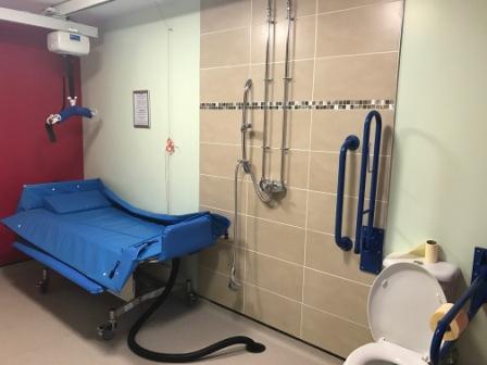 FACILITIES: Bench – Height Adjustable, Adult Sized, Free Standing | Hoist – Ceiling | Peninsular Toilet | Non-Slip Floor | Floor Space (sq. m) – 12 | Emergency Alarm | Paper Roll | Radar Key | Managed | Locked | Accessible Shower