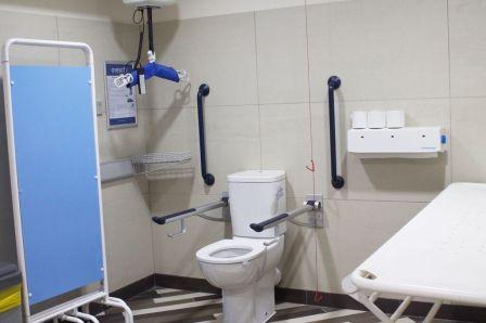 FACILITIES: Bench – Height Adjustable, Adult Sized, Free Standing | Hoist – Ceiling | Peninsular Toilet | Non-Slip Floor | Floor Space (sq. m) – 10 | Emergency Alarm | Privacy Screen | Paper Roll | Radar Key | Managed | Locked Colostomy Shelf