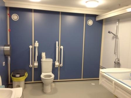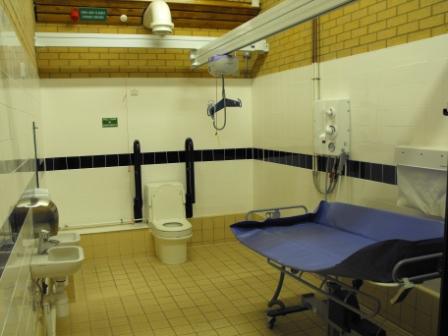 FACILITIES: Bench – Height Adjustable, Adult Sized, Free Standing | Hoist – Ceiling | Peninsular Toilet | Height Adjustable Washbasin | Non-Slip Floor | Floor Space (sq. m) – 12 | Emergency Alarm | Privacy Screen | Paper Roll Radar Key | Managed | Locked | Colostomy Shelf