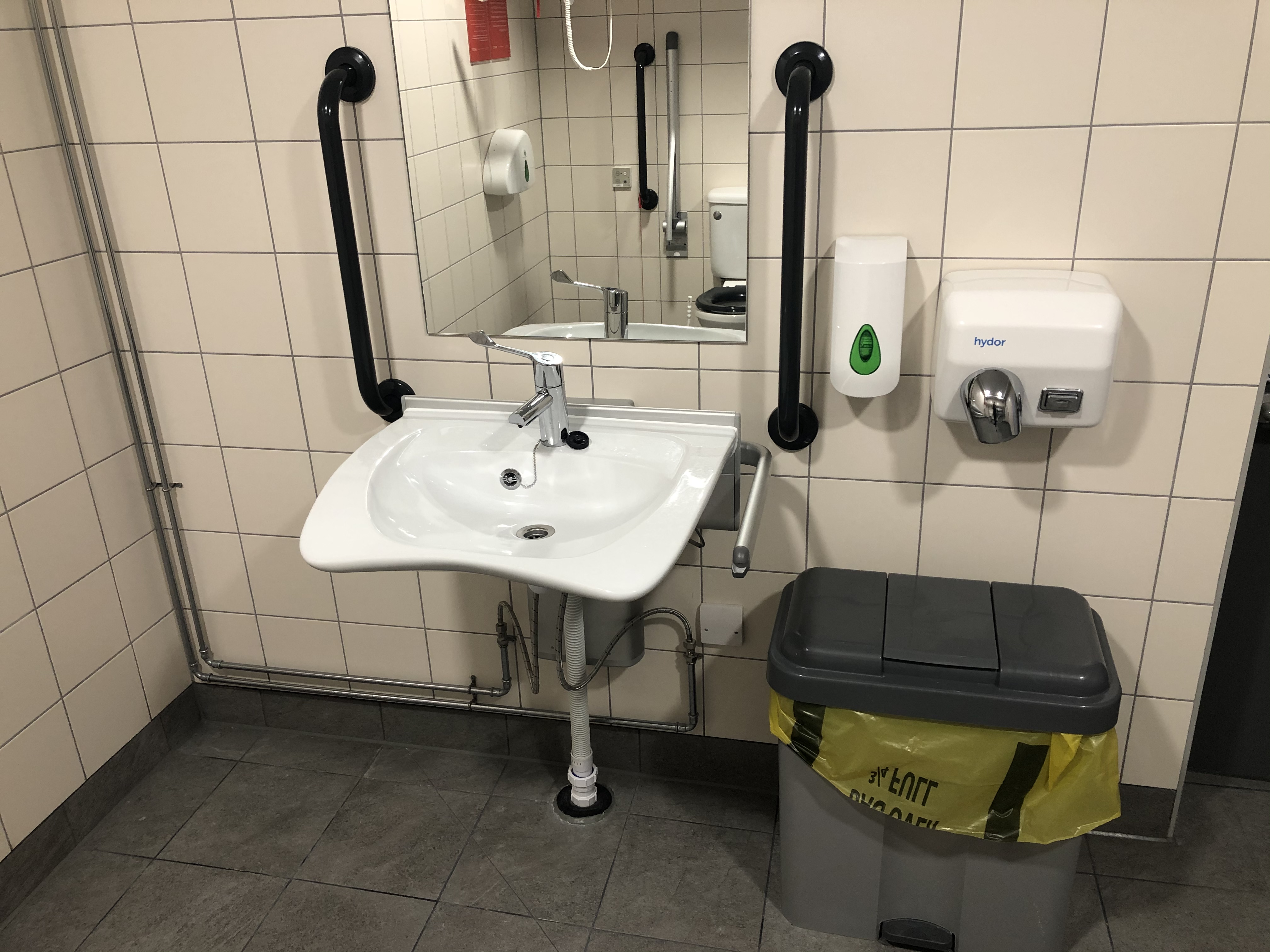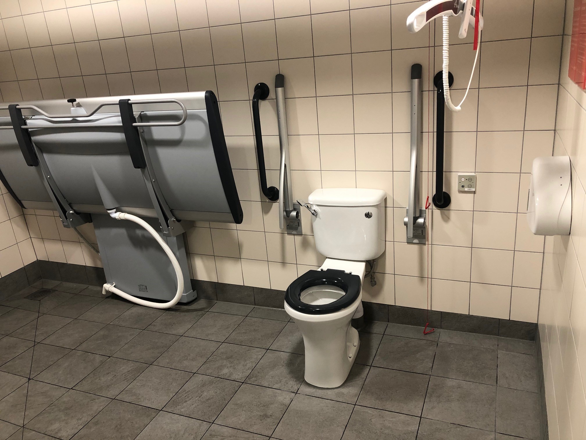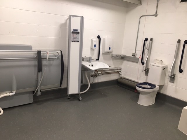 FACILITIES: Bench – Height Adjustable, Adult Sized, Wall Mounted | Hoist – Ceiling | Peninsular Toilet | Height Adjustable Washbasin | Non-Slip Floor | Floor Space (sq. m) – 12 | Emergency Alarm | Paper Roll | Radar Key Managed | Locked | Colostomy Shelf