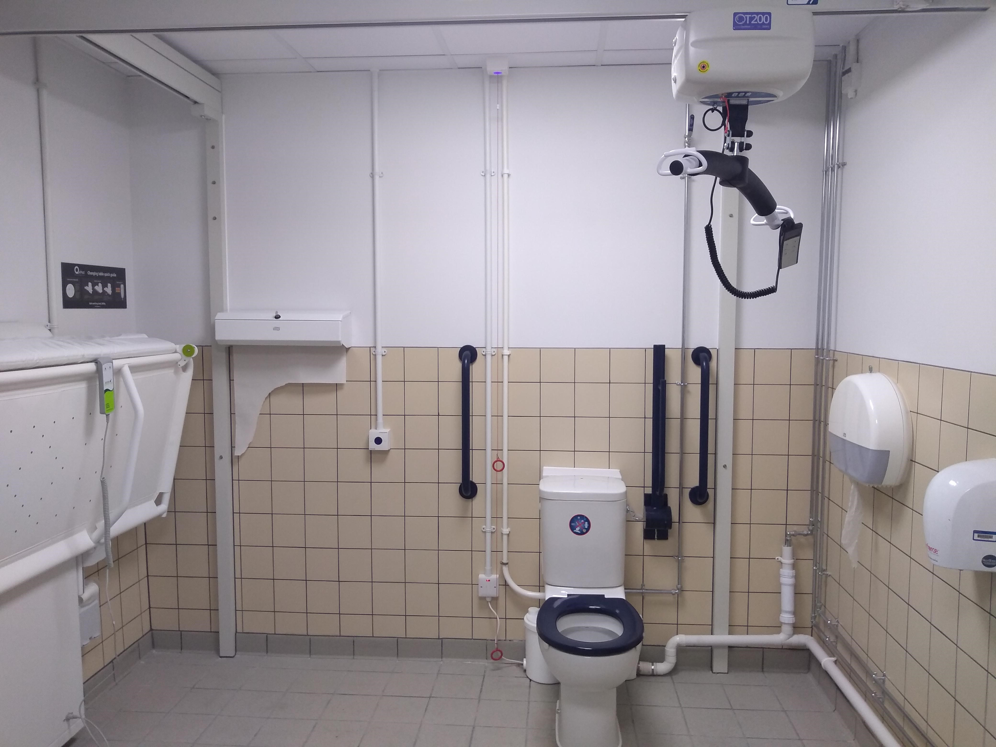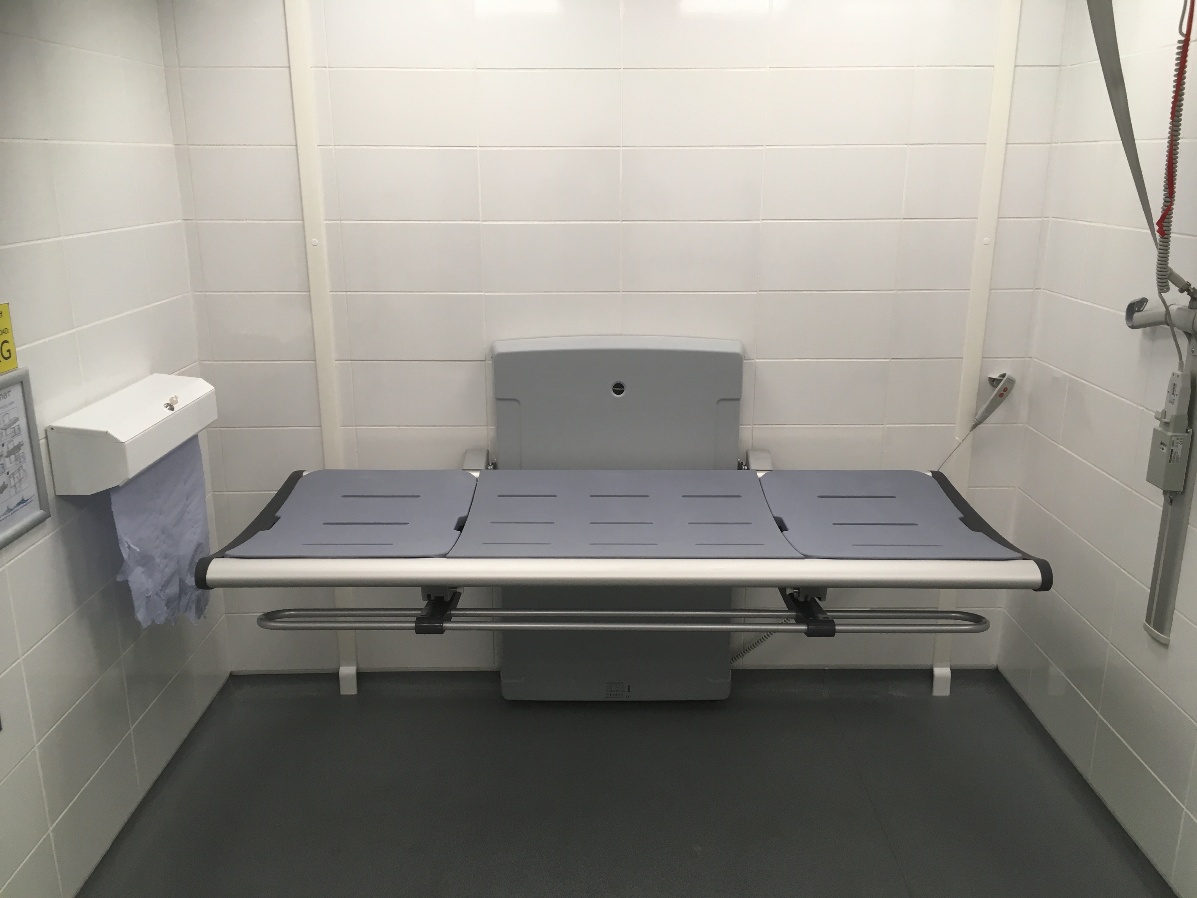 FACILITIES: Bench – Height Adjustable, Adult Sized, Free Standing | Hoist – Ceiling | Peninsular Toilet | Non-Slip Floor | Floor Space (sq. m) – 15 | Emergency Alarm | Privacy Screen | Paper Roll | Radar Key | Managed | Locked Colostomy Shelf