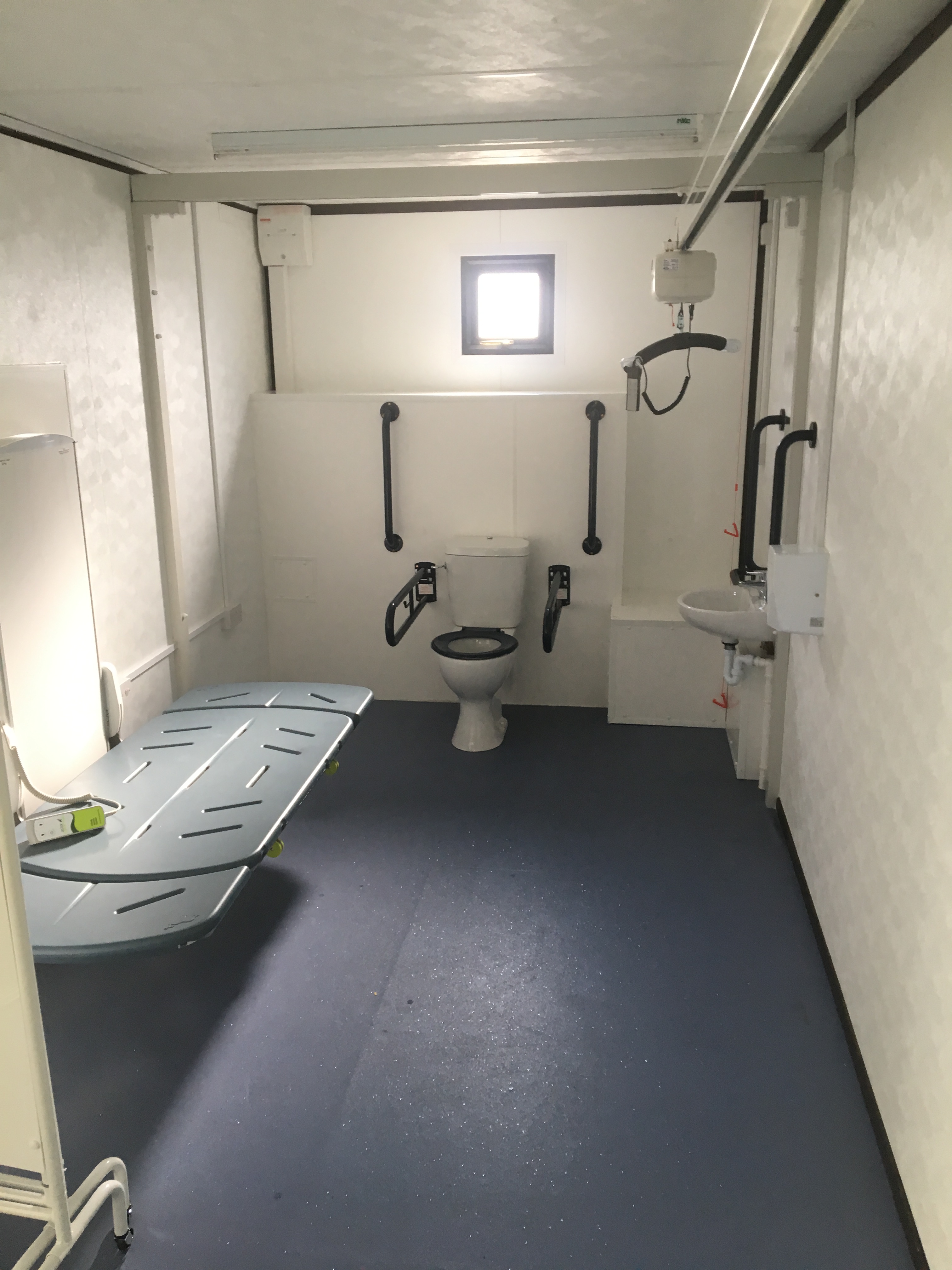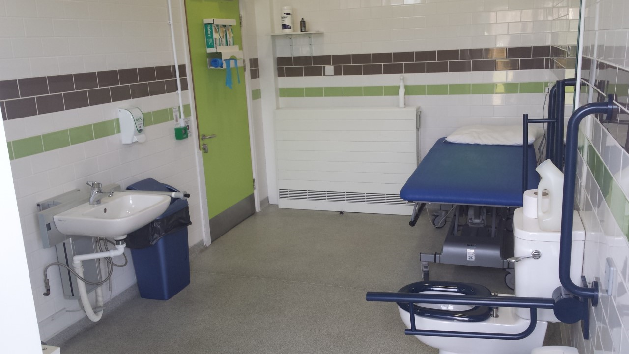 FACILITIES: Bench – Height Adjustable, Adult Sized, Free Standing | Hoist – Ceiling | Peninsular Toilet | Height Adjustable Washbasin | Non-Slip Floor | Floor Space (sq. m) – 11 | Emergency Alarm | Privacy Screen | Paper Roll Radar Key | Managed | Locked | Colostomy Shelf