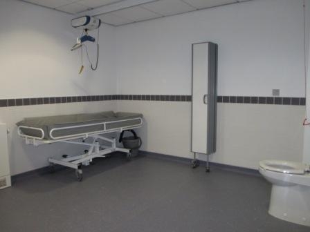FACILITIES: Bench – Height Adjustable, Adult Sized, Free Standing | Hoist – Ceiling | Peninsular Toilet | Non-Slip Floor | Floor Space (sq. m) – 14 | Emergency Alarm | Privacy Screen | Paper Roll | Managed