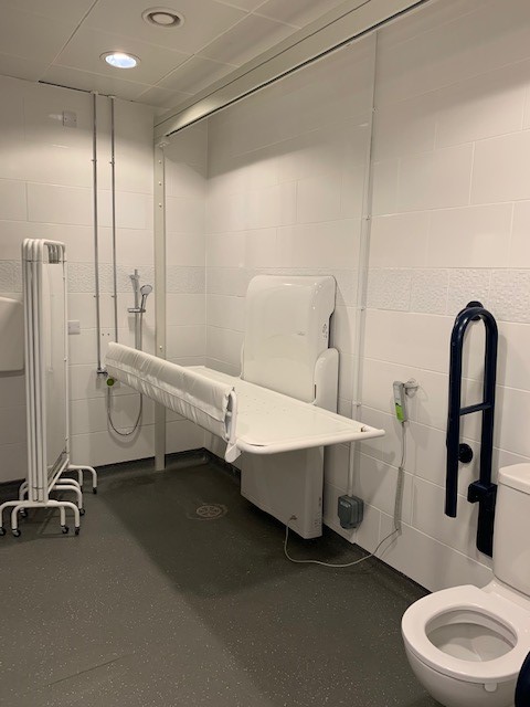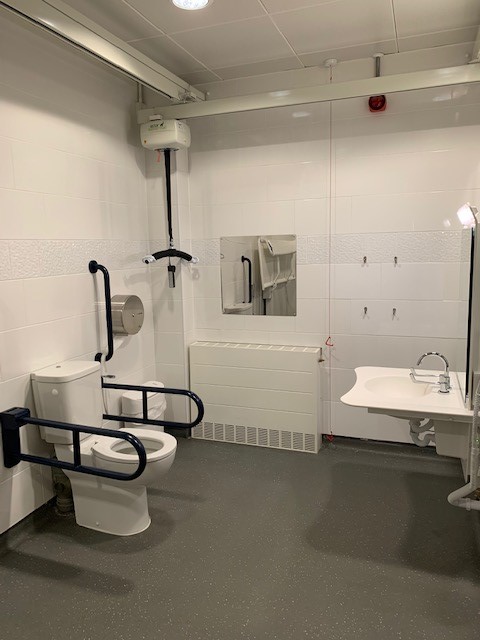 FACILITIES: Bench – Height Adjustable, Adult Sized, Wall Mounted | Hoist – Ceiling | Peninsular Toilet | Non-Slip Floor | Floor Space (sq. m) – 7.0 | Emergency Alarm | Paper Roll | Radar Key | Managed | Locked