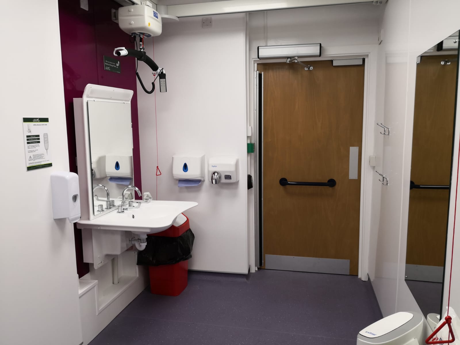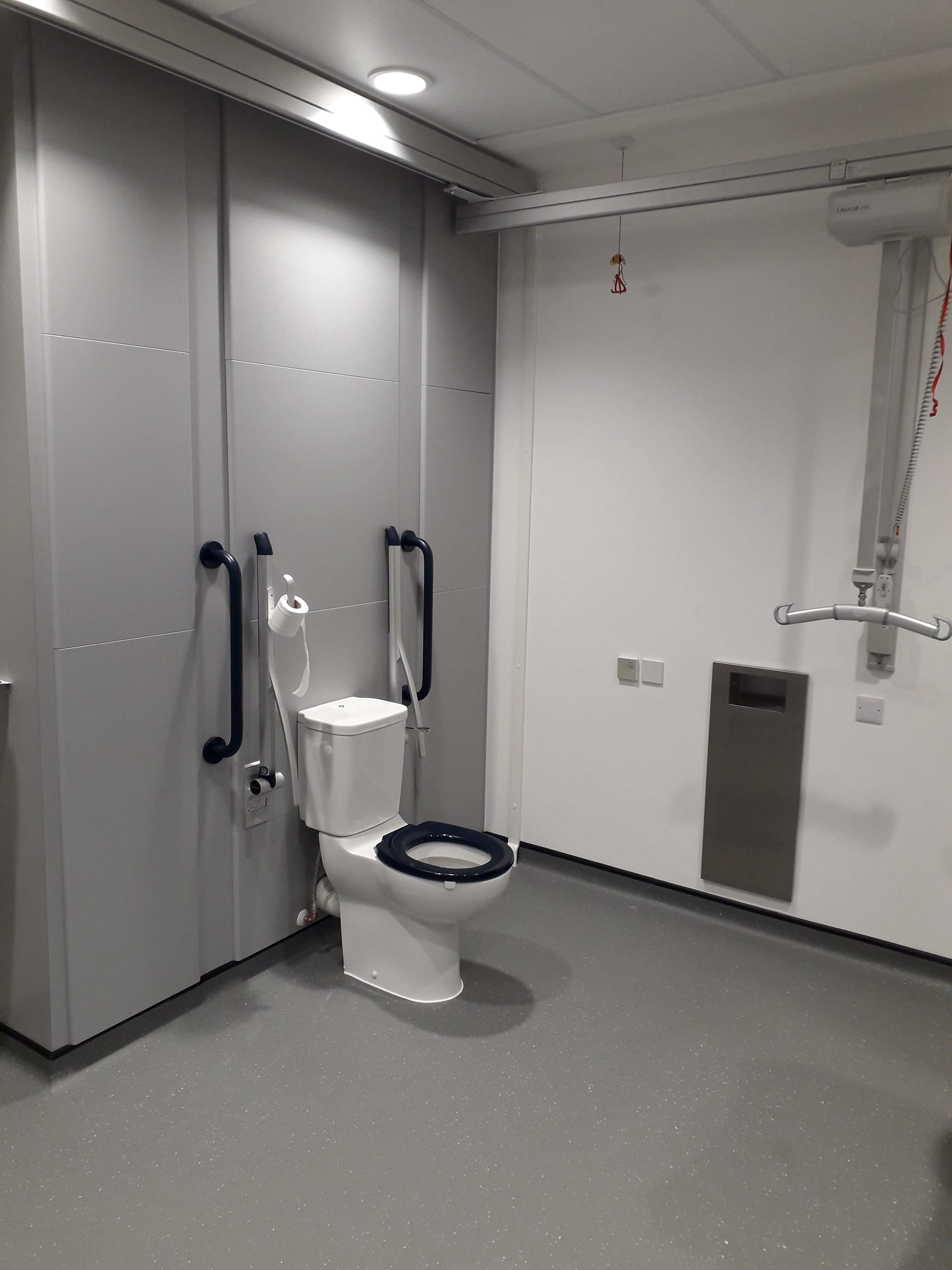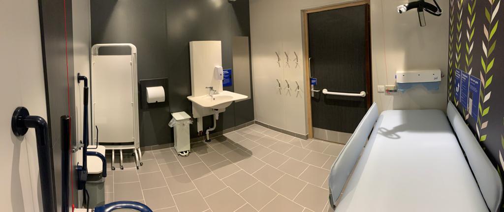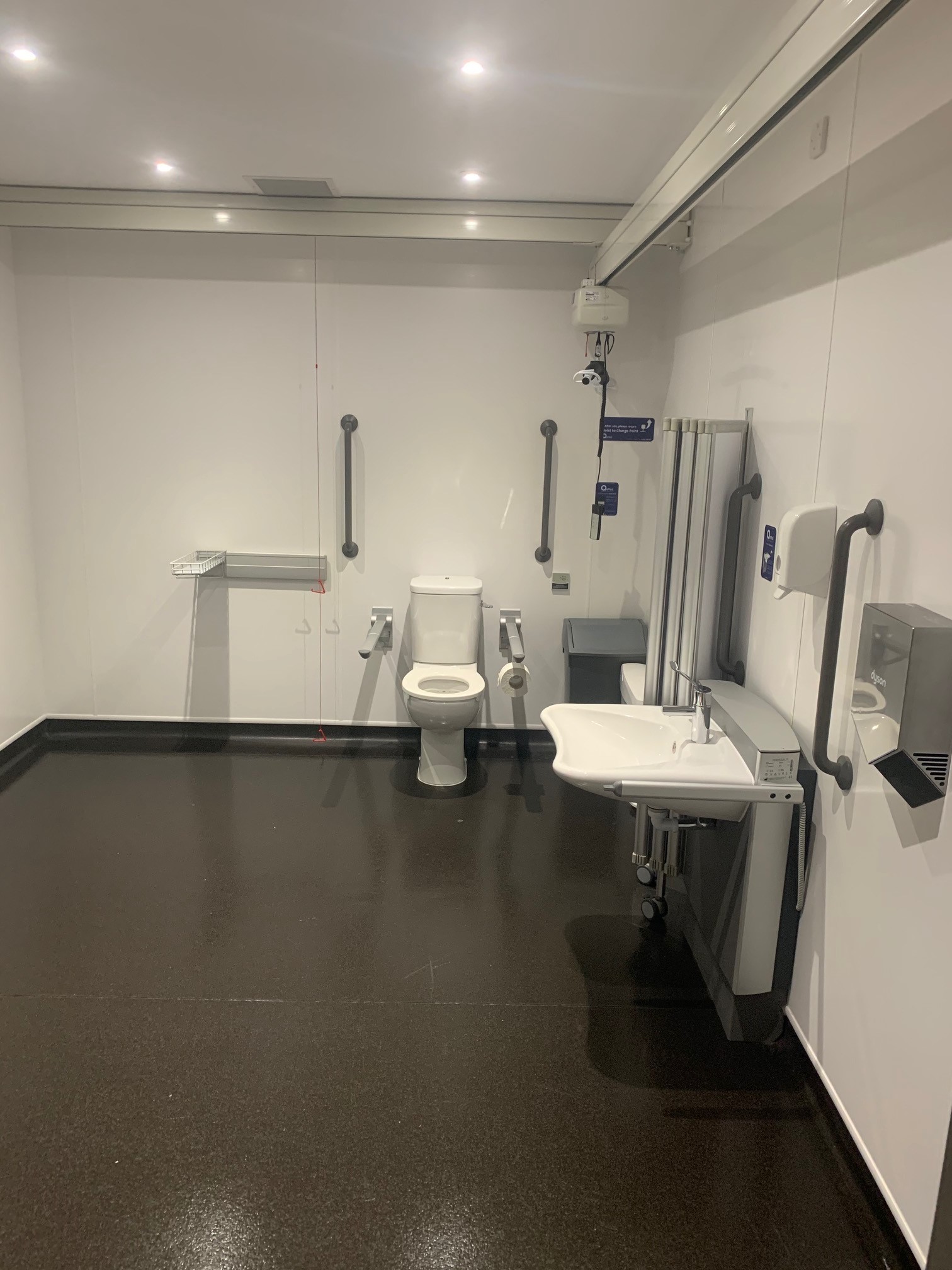 FACILITIES: Bench – Height Adjustable, Adult Sized, Free Standing | Hoist – Ceiling | Peninsular Toilet | Height Adjustable Washbasin | Non-Slip Floor | Floor Space (sq. m) – 10 | Emergency Alarm | Privacy Screen | Paper Roll Radar Key | Managed | Locked | Colostomy Shelf