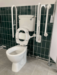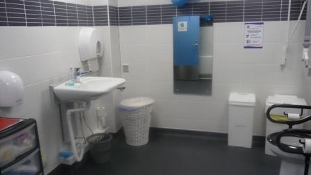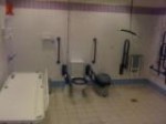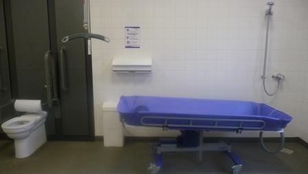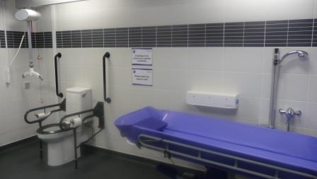 FACILITIES: Bench – Height Adjustable, Adult Sized, Wall Mounted | Hoist – Ceiling | Peninsular Toilet | Non-Slip Floor | Floor Space (sq. m) – 13 | Emergency Alarm | Privacy Screen | Paper Roll | Radar Key | Managed | Locked Accessible Shower | Colostomy Shelf