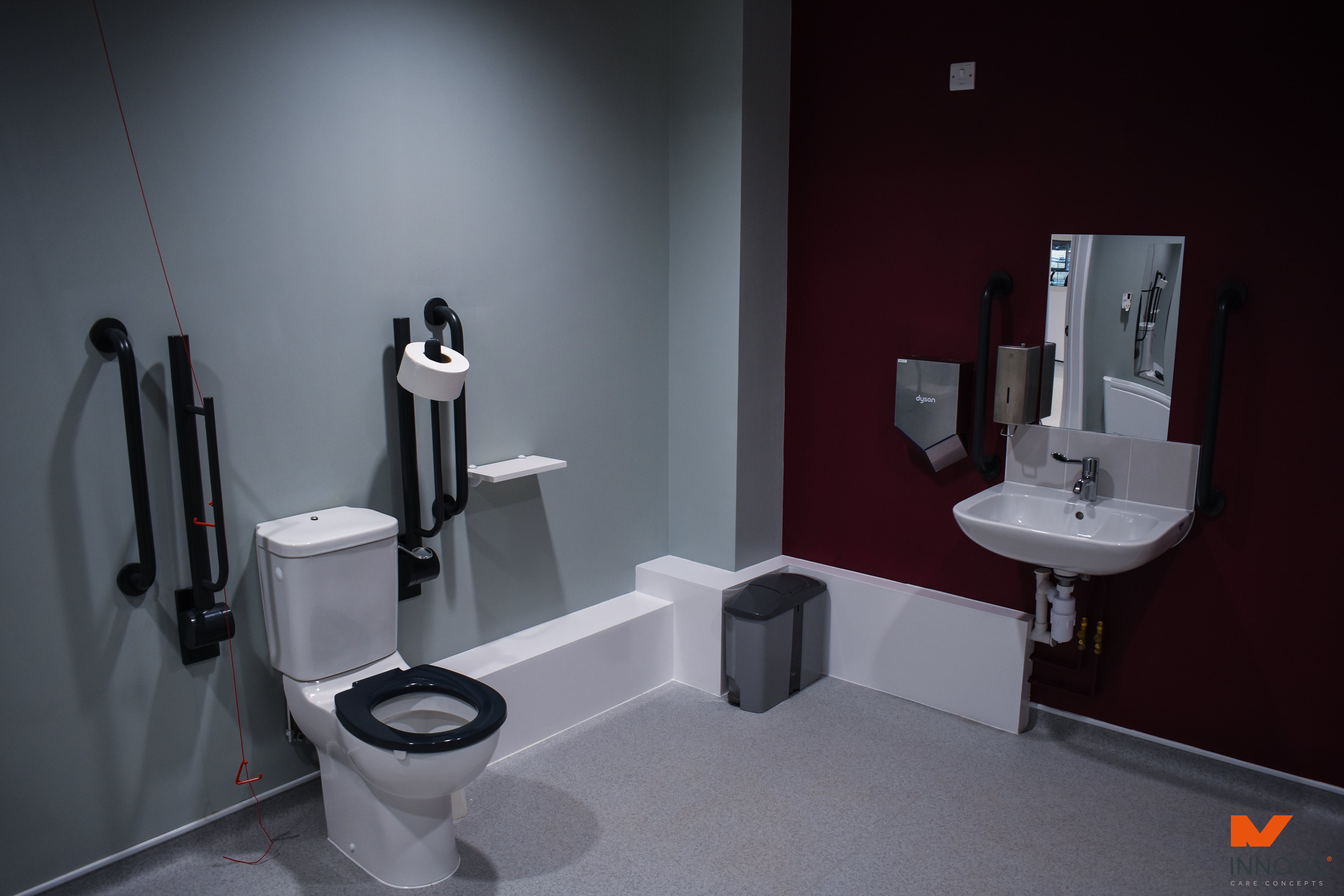 FACILITIES: Bench – Height Adjustable, Adult Sized, Wall Mounted | Hoist – Ceiling | Peninsular Toilet | Height Adjustable Washbasin | Non-Slip Floor | Floor Space (sq. m) – 12 | Emergency Alarm | Privacy Screen | Paper Roll Managed