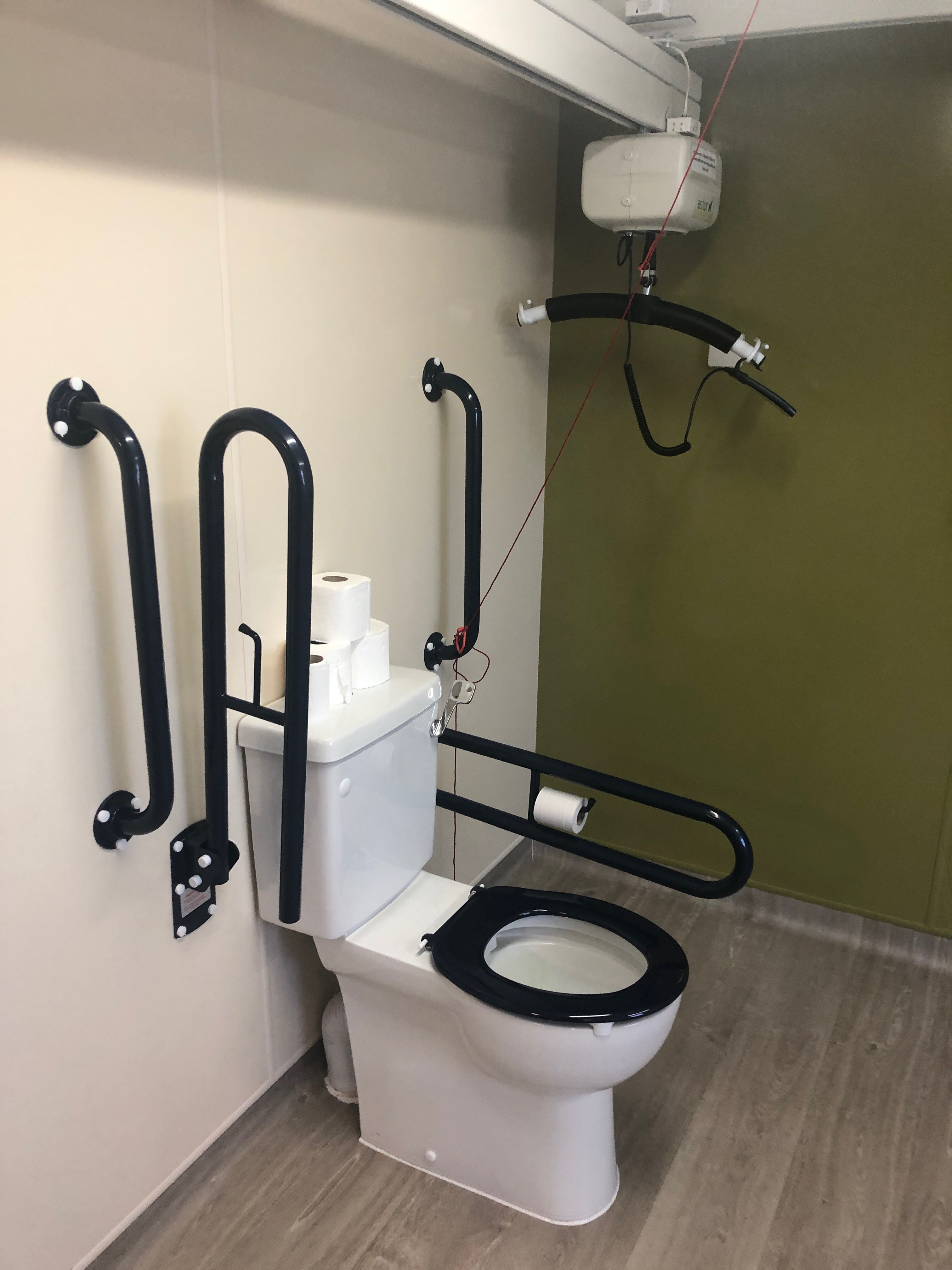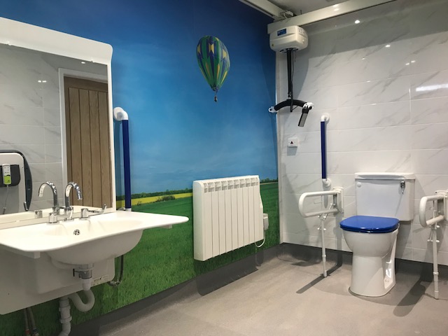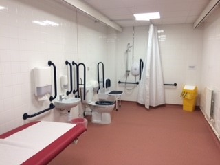 FACILITIES: Bench – Height Adjustable, Adult Sized, Free Standing | Hoist – Ceiling | Peninsular Toilet | Height Adjustable Washbasin | Non-Slip Floor | Floor Space (sq. m) – 28 | Emergency Alarm | Privacy Screen | Paper Roll Managed | Locked | Colostomy Shelf