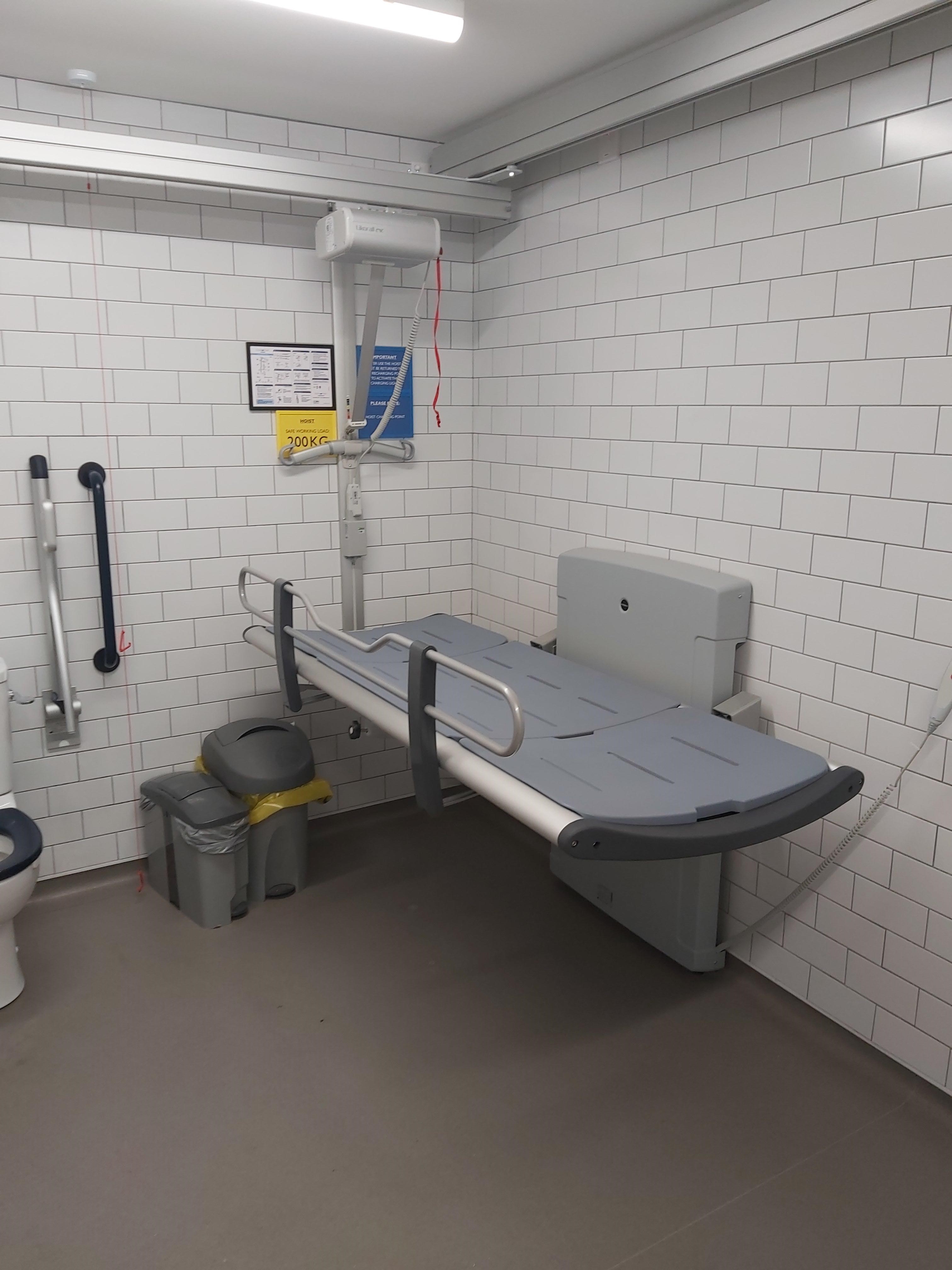 FACILITIES: Bench – Height Adjustable, Adult Sized, Free Standing | Hoist – Ceiling | Peninsular Toilet | Non-Slip Floor | Floor Space (sq. m) – 12 | Emergency Alarm | Privacy Screen | Paper Roll | Radar Key | Managed | Locked Accessible Shower