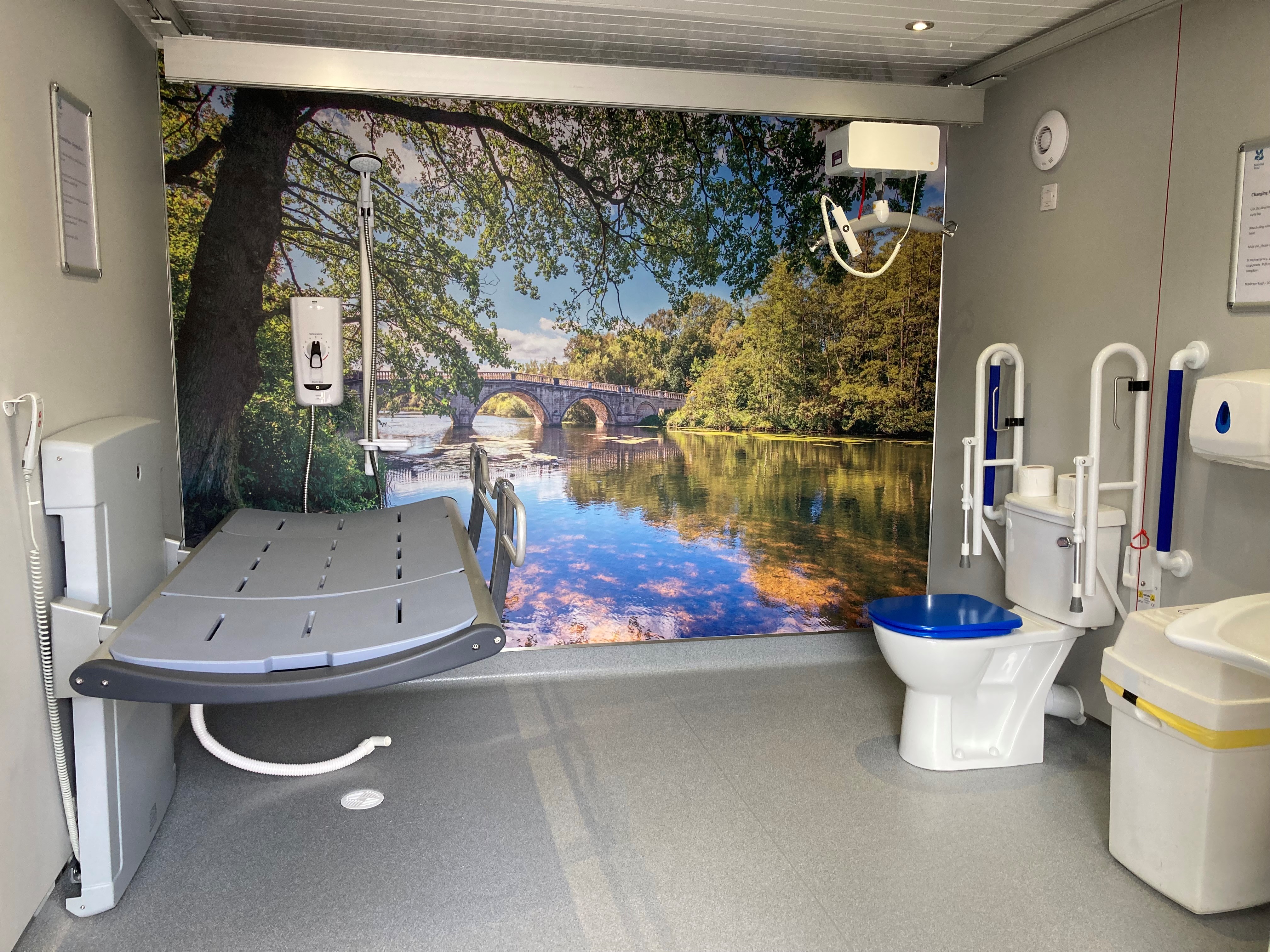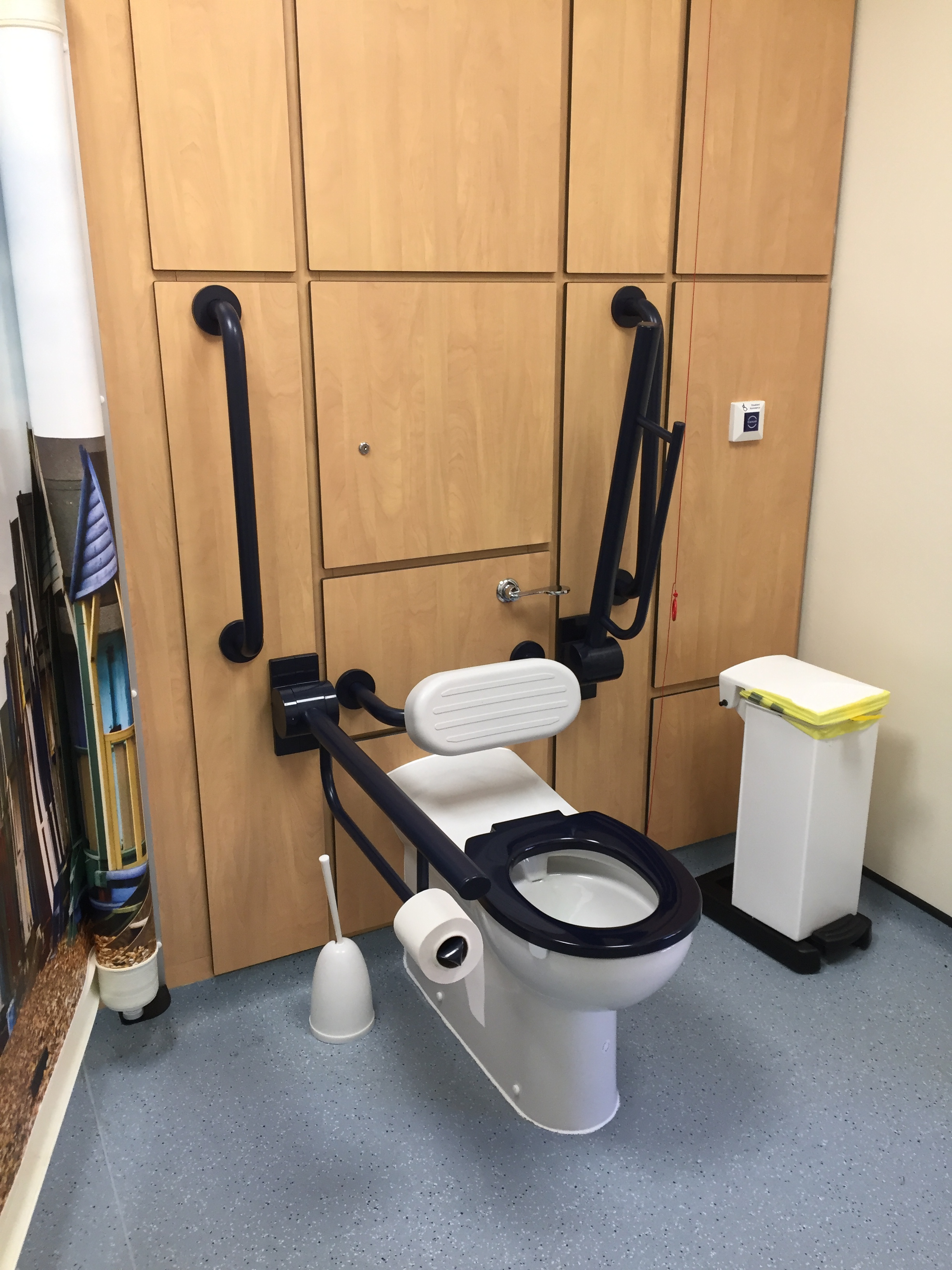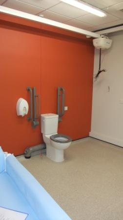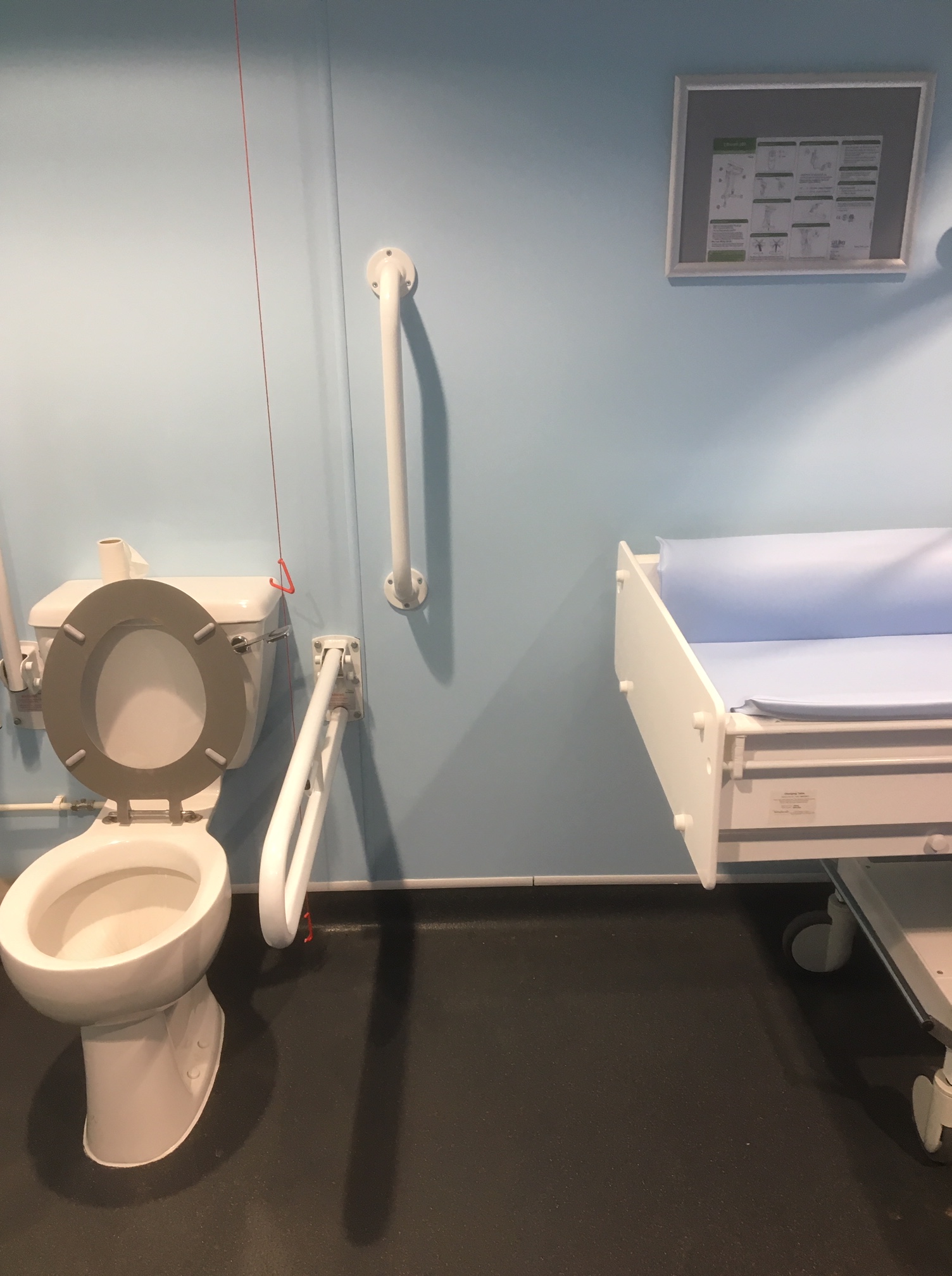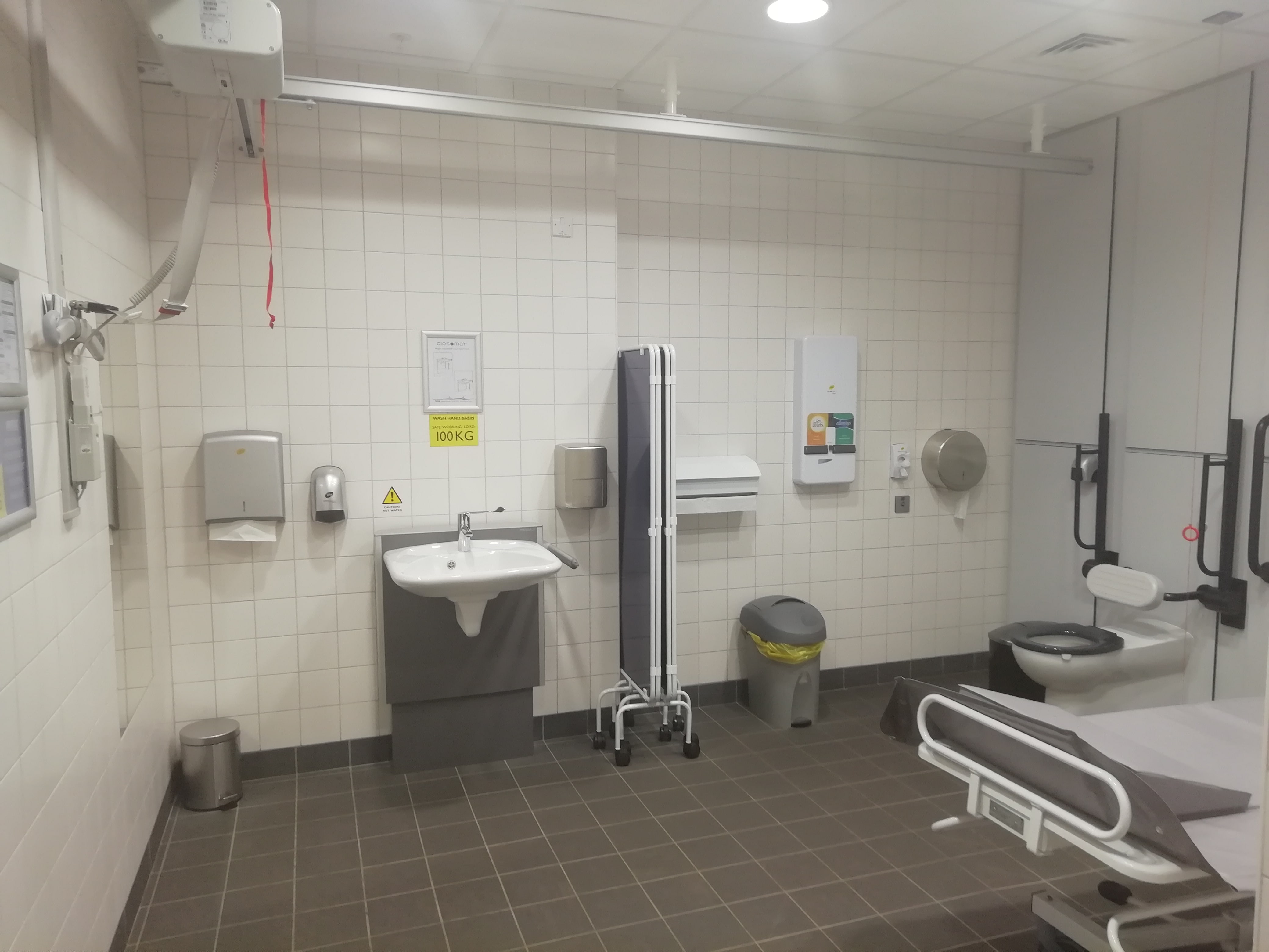 FACILITIES: Bench – Height Adjustable, Adult Sized, Free Standing | Hoist – Ceiling | Peninsular Toilet | Non-Slip Floor | Floor Space (sq. m) – 12 | Emergency Alarm | Privacy Screen | Paper Roll | Radar Key | Managed | Locked