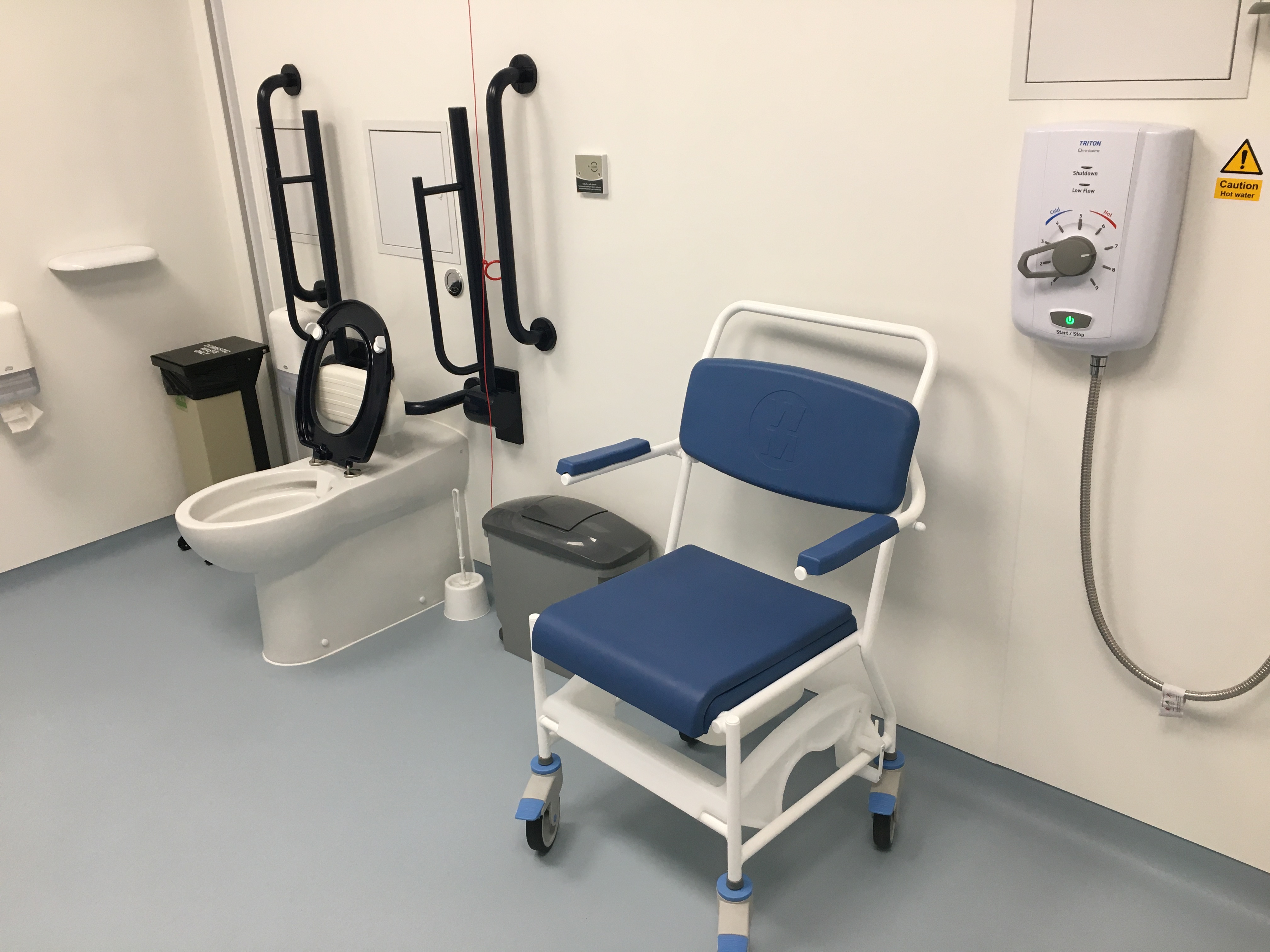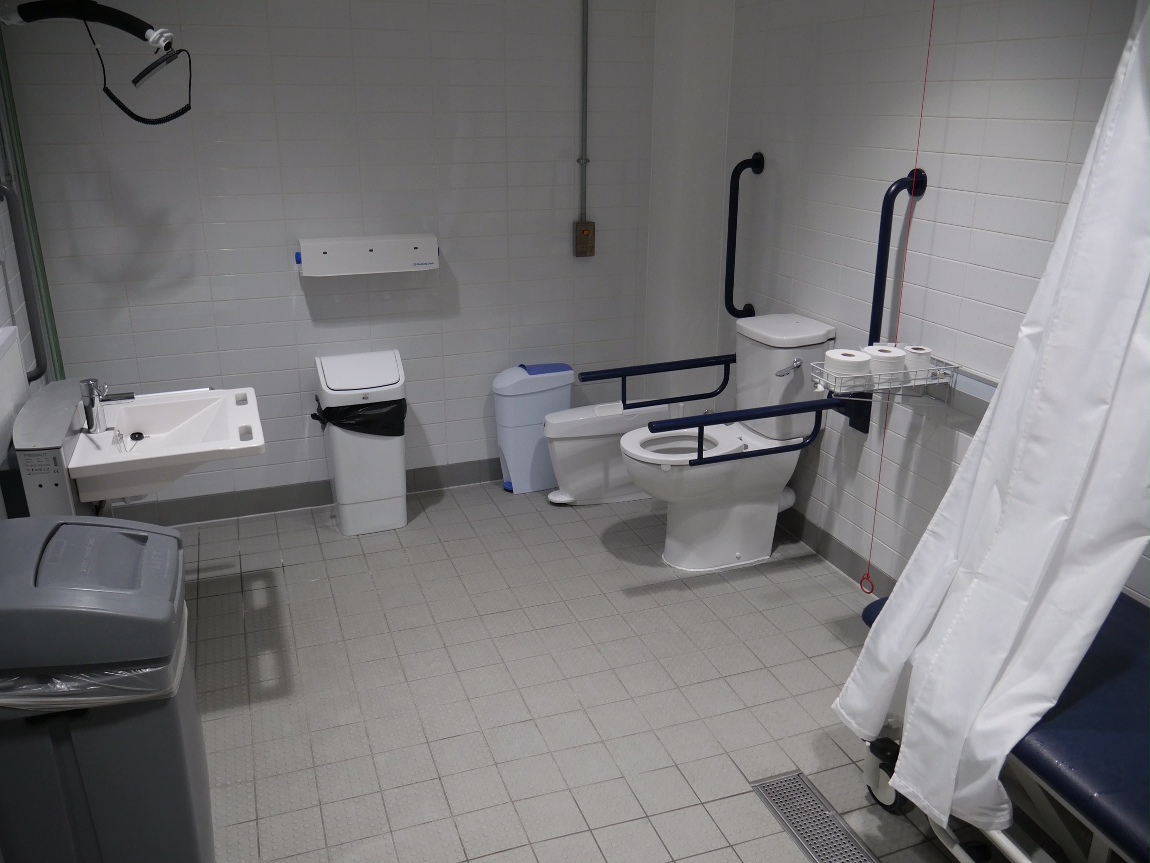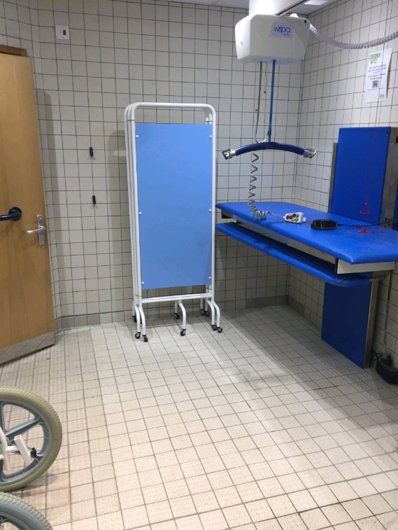 FACILITIES: Bench – Height Adjustable, Adult Sized, Free Standing | Hoist – Ceiling | Peninsular Toilet | Non-Slip Floor | Emergency Alarm | Privacy Screen | Paper Roll | Managed | Locked | Accessible Shower