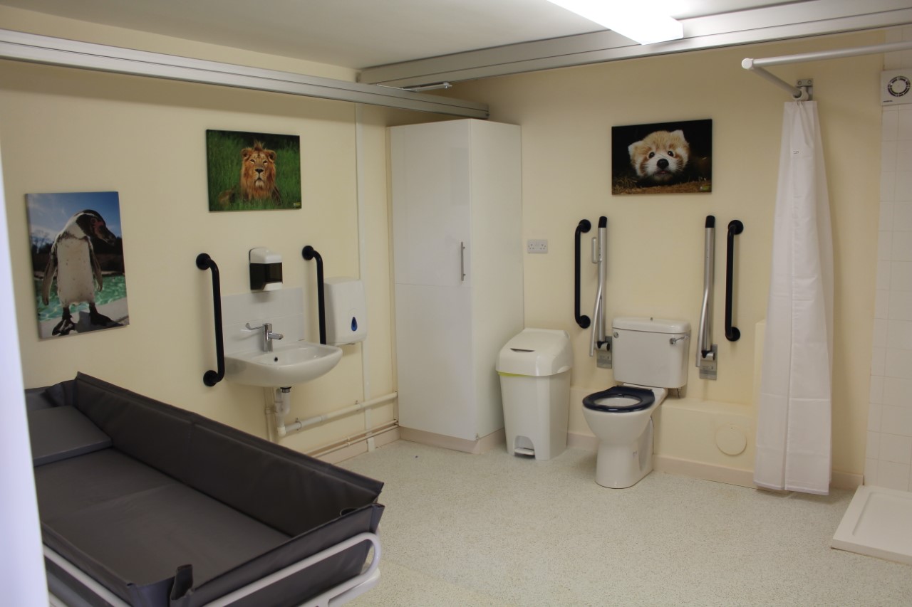 FACILITIES: Bench – Height Adjustable, Adult Sized, Wall Mounted | Hoist – Ceiling | Peninsular Toilet | Height Adjustable Washbasin | Non-Slip Floor | Floor Space (sq. m) – 14 | Emergency Alarm | Privacy Screen | Paper Roll Radar Key | Locked | Colostomy Shelf