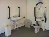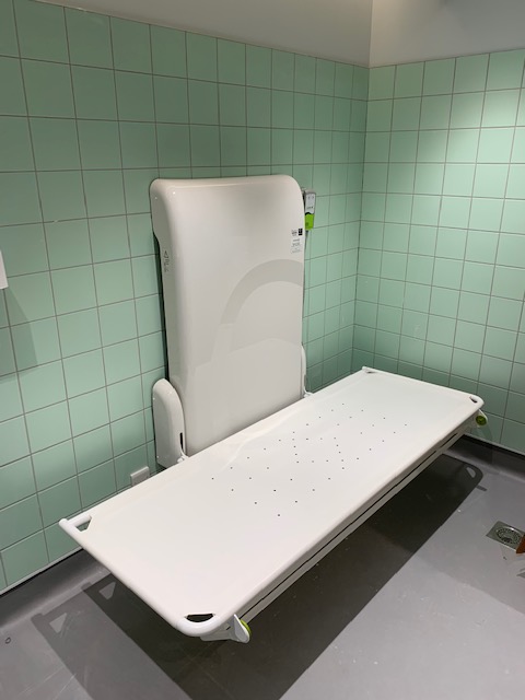 FACILITIES: Bench – Height Adjustable, Adult Sized, Free Standing | Hoist – Ceiling | Peninsular Toilet | Non-Slip Floor | Floor Space (sq. m) – 8 | Emergency Alarm | Privacy Screen | Paper Roll | Radar Key | Managed | Locked Colostomy Shelf