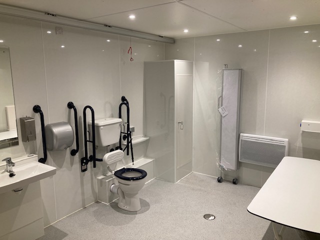 FACILITIES: Bench – Height Adjustable, Adult Sized, Wall Mounted | Hoist – Ceiling | Peninsular Toilet | Height Adjustable Washbasin | Non-Slip Floor | Floor Space (sq. m) – 12 | Emergency Alarm | Privacy Screen | Paper Roll Managed | Locked | Colostomy Shelf