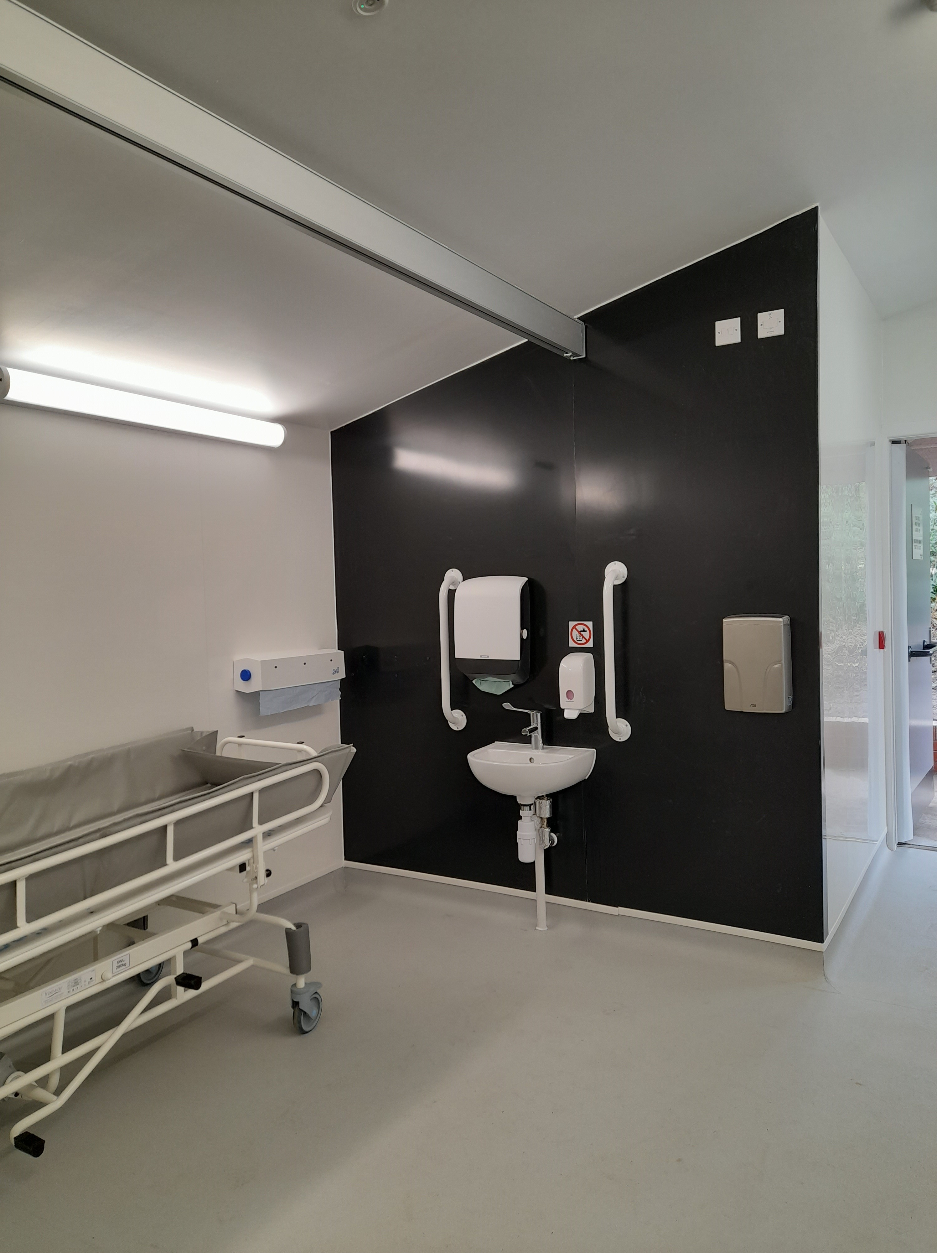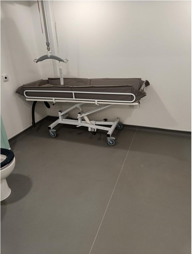 FACILITIES: Bench – Height Adjustable, Adult Sized, Free Standing | Hoist – Ceiling | Peninsular Toilet | Non-Slip Floor | Floor Space (sq. m) – 12 | Emergency Alarm | Paper Roll | Managed | Accessible Shower