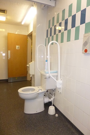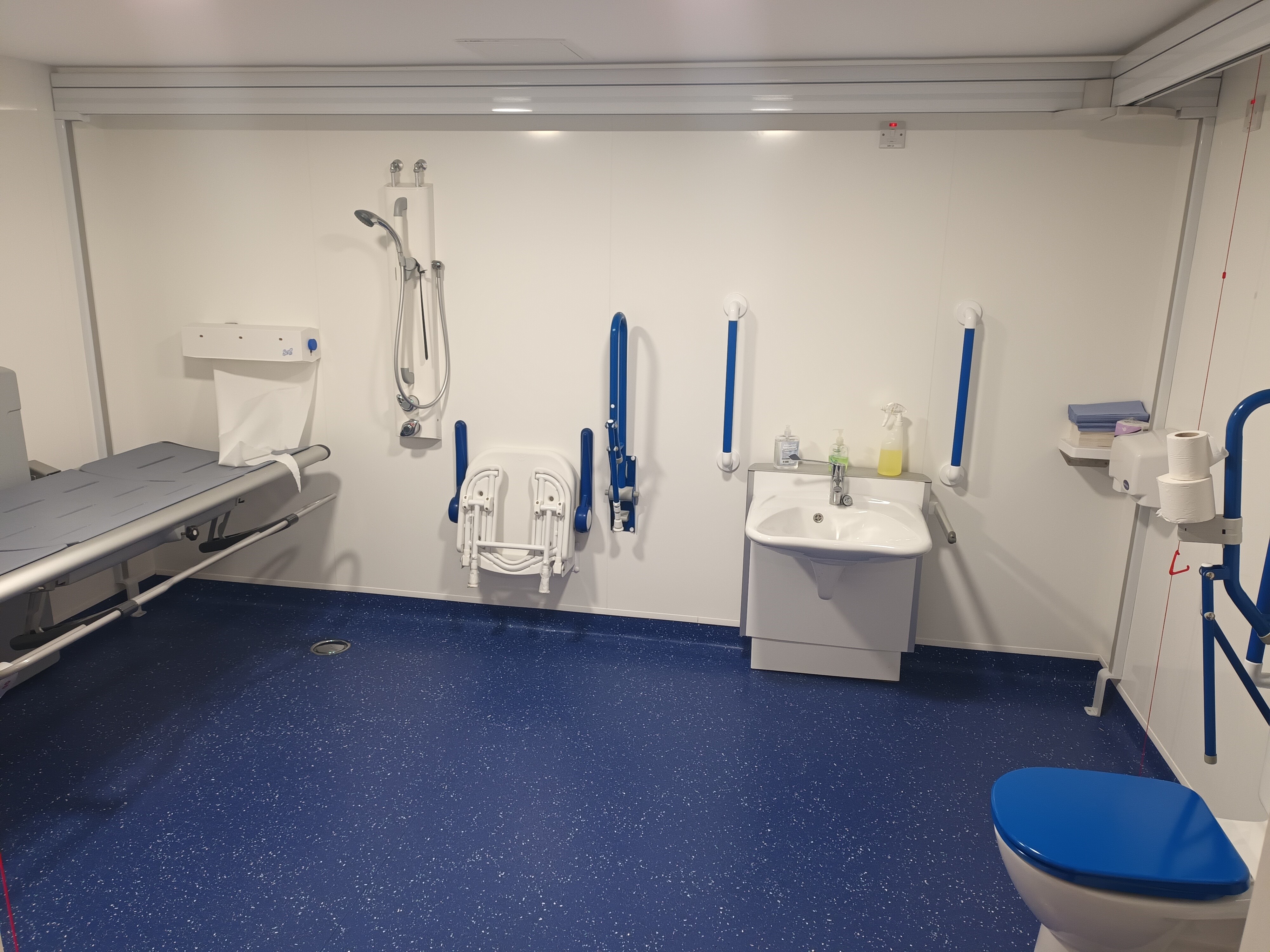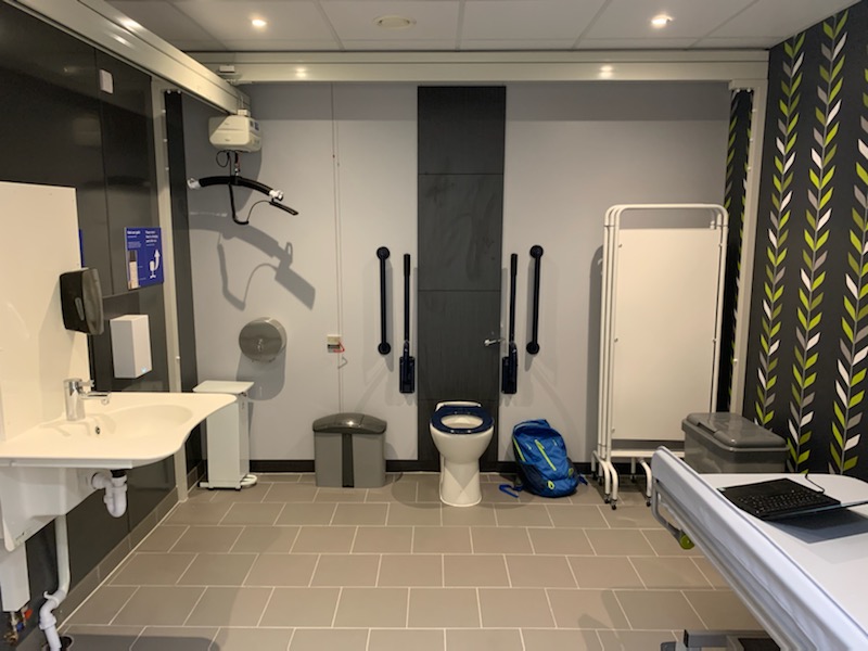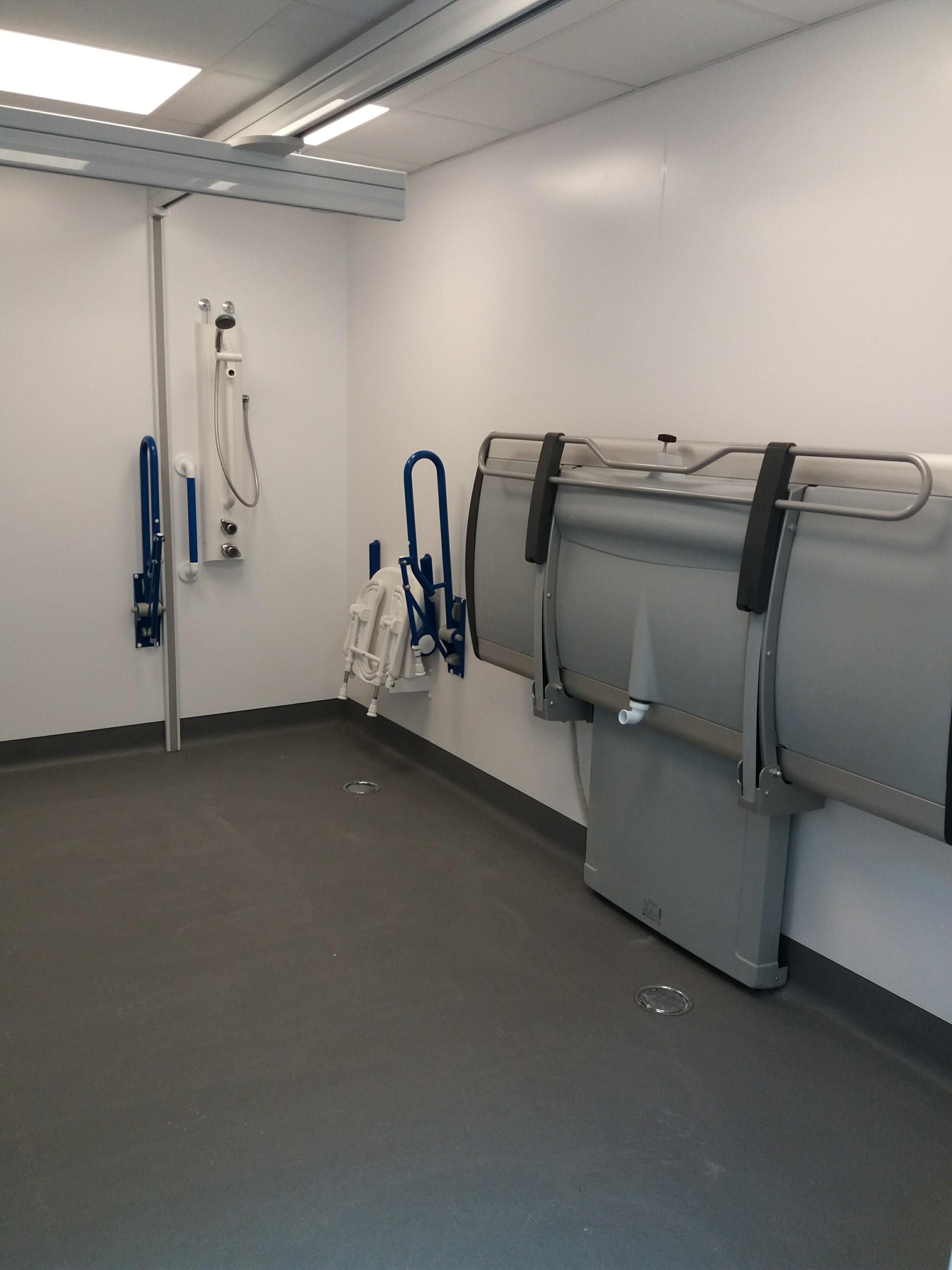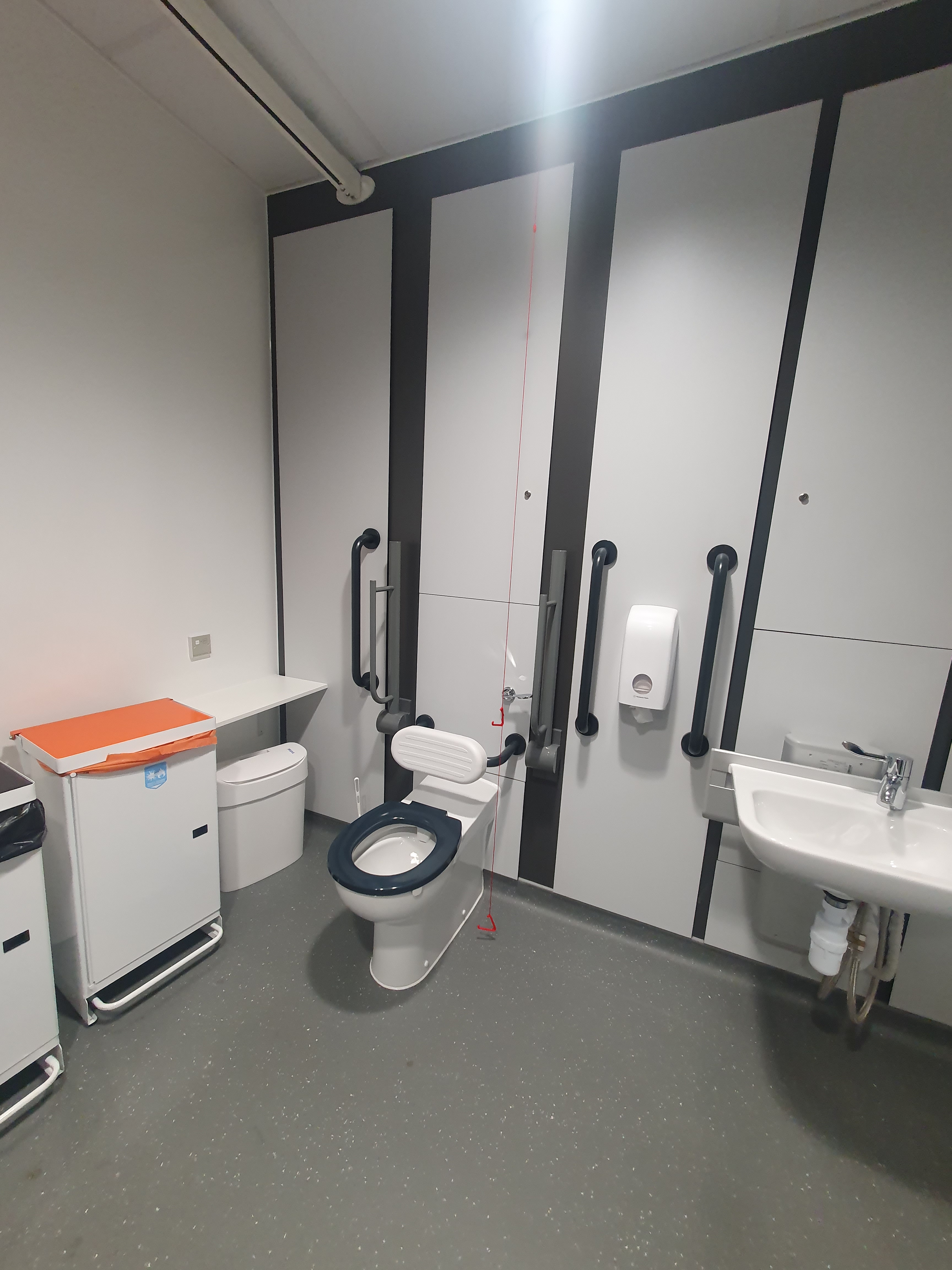 FACILITIES: Bench – Height Adjustable, Adult Sized, Free Standing | Hoist – Ceiling | Peninsular Toilet | Non-Slip Floor | Floor Space (sq. m) – 15 | Emergency Alarm | Paper Roll | Radar Key | Managed | Locked | Accessible Shower Colostomy Shelf