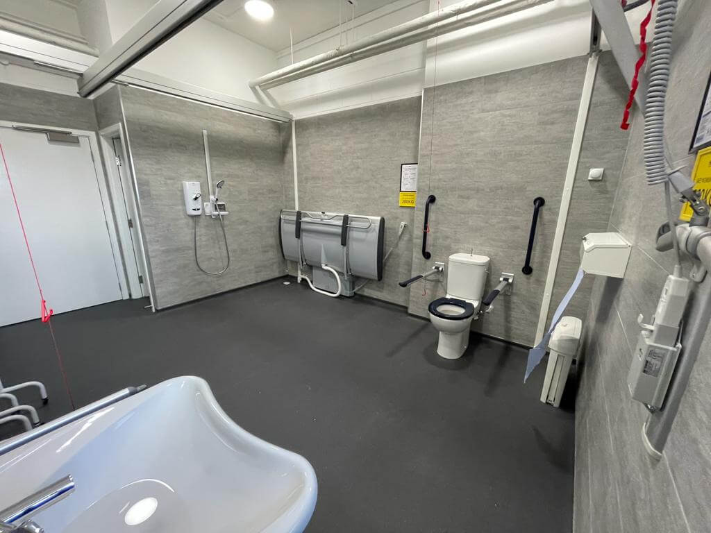 FACILITIES: Bench – Height Adjustable, Adult Sized, Free Standing | Hoist – Ceiling | Peninsular Toilet | Non-Slip Floor | Floor Space (sq. m) – 12 | Emergency Alarm | Paper Roll | Managed | Accessible Shower