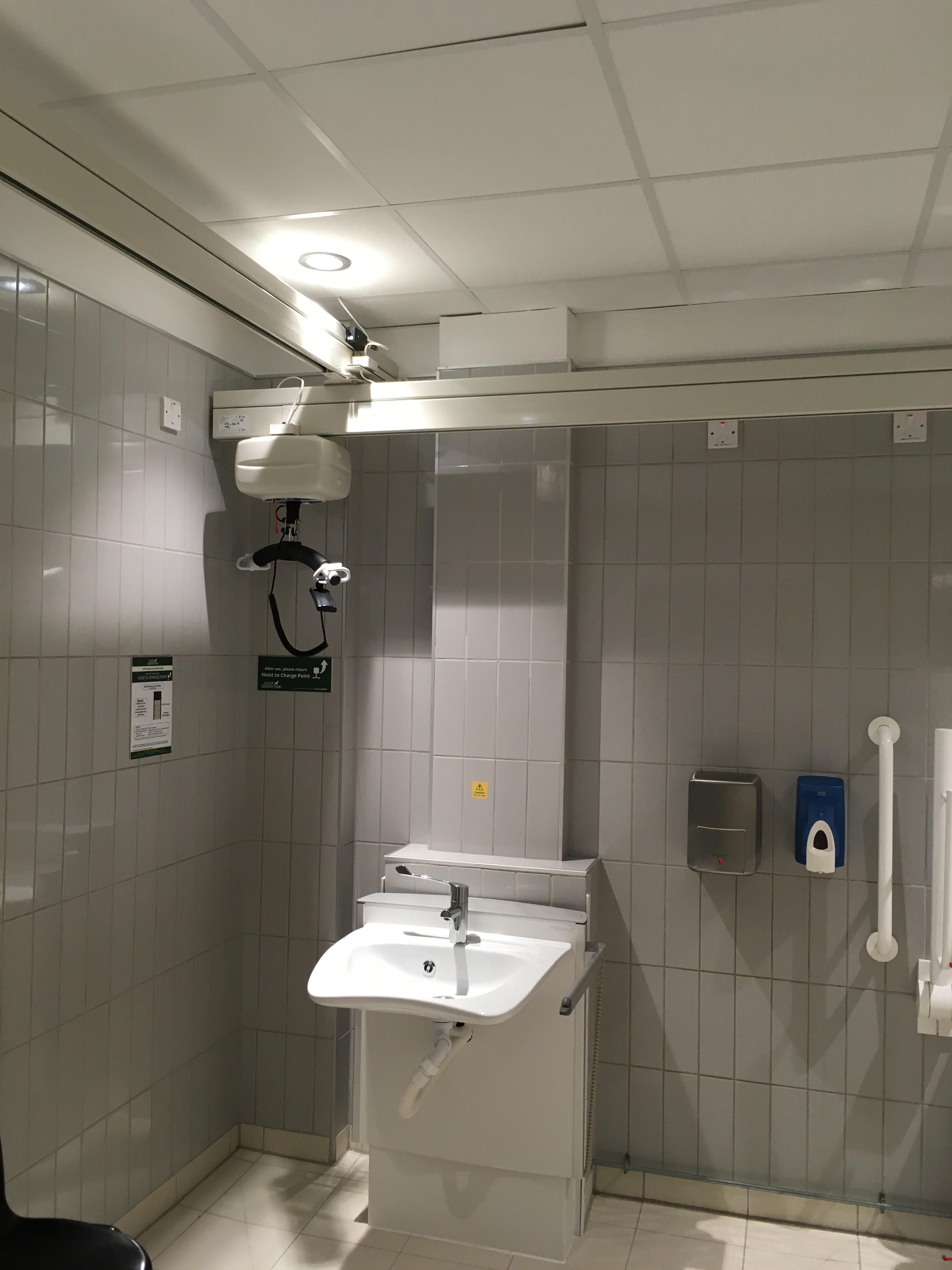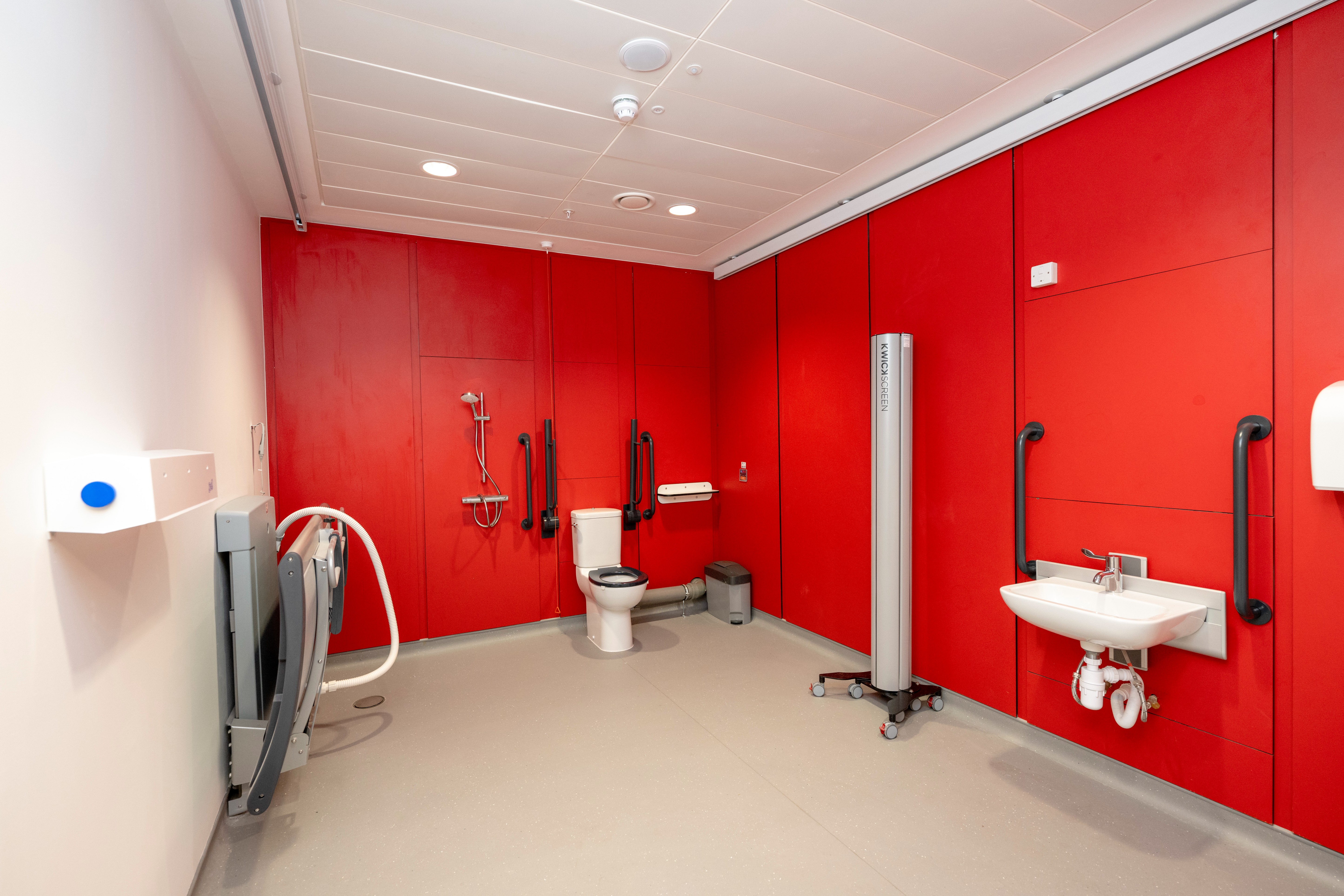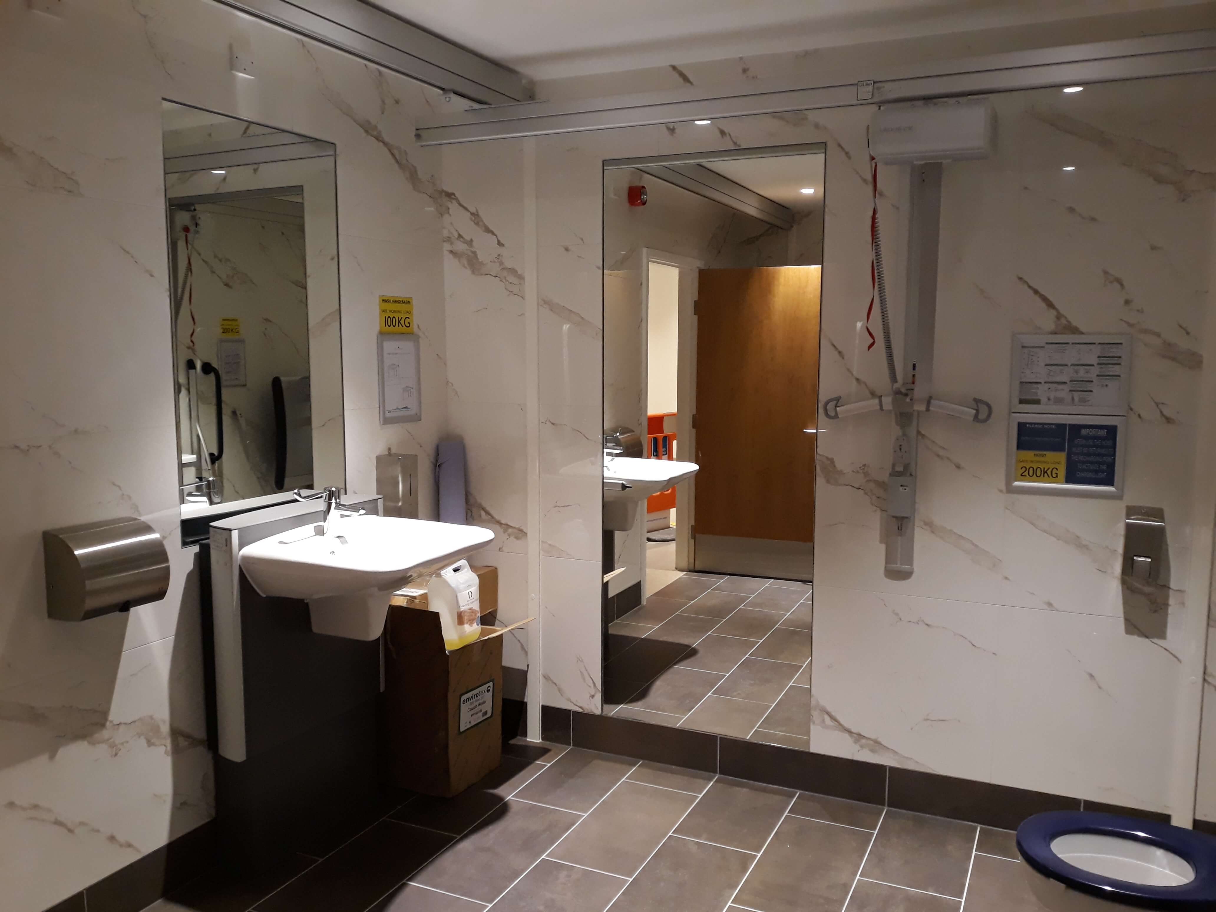 FACILITIES: Bench – Height Adjustable, Adult Sized, Wall Mounted | Hoist – Ceiling | Peninsular Toilet | Height Adjustable Washbasin | Non-Slip Floor | Floor Space (sq. m) – 12 | Emergency Alarm | Privacy Screen | Paper Roll Radar Key | Managed | Locked